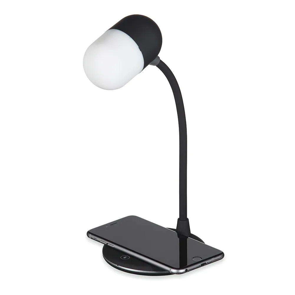 Luminária LED de mesa, articulável, superfície para carregar dispositivos por indução (wireless) de 5W e “Speaker” “Bluetooth” com 3W de potência.