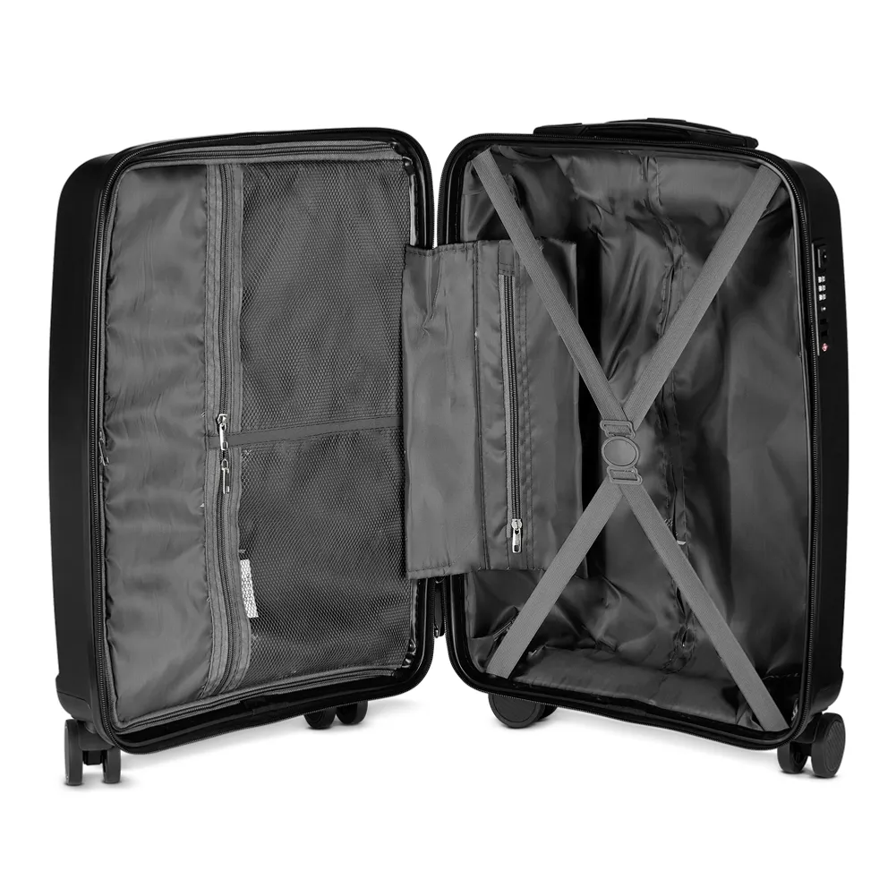 Mala de bordo em plástico PP  Abertura frontal com ziper para acesso ao interior da mala; Forro poliéster; Sistema de carrinho de aço; Alça de mão na parte superior; Quatro rodas de 360 graus; Acompanha Plaquinha de metal sem personalização. Mala perfurada para aplicação da plaquinha.