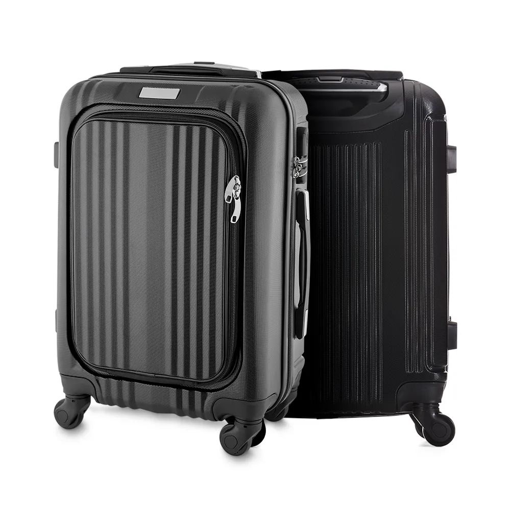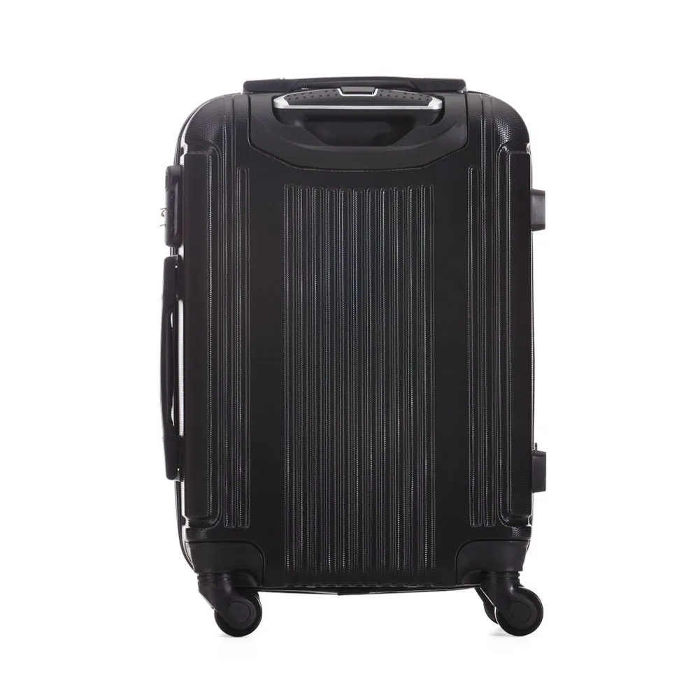 Mala viagem pequena em ABS (Estireno de acrilonitrilo e butadieno); Abertura frontal com ziper para acesso ao interior da mala com três bolsos interno; Forro poliéster; Sistema de carrinho de aço; Alça de mão na lateral e na parte superior; Quatro rodas de 360 graus; Acompanha Plaquinha de metal sem personalização.