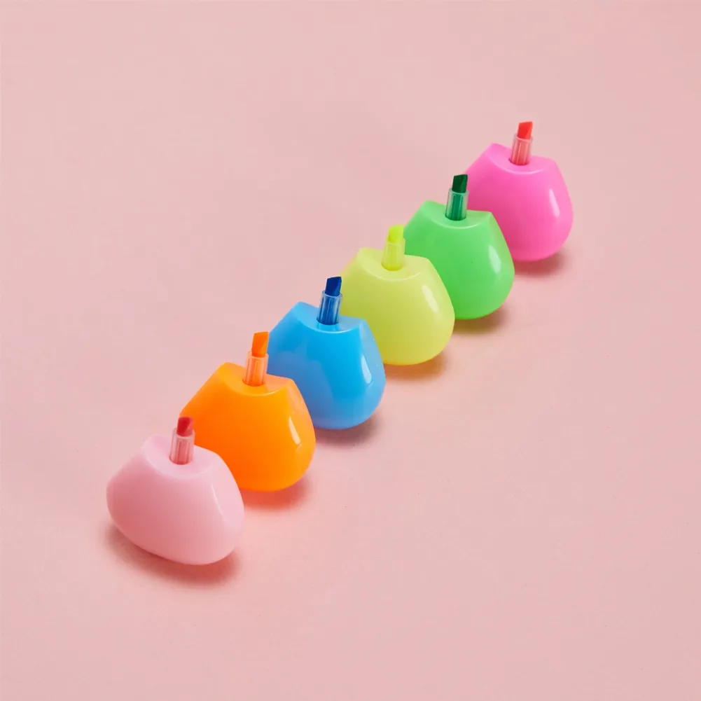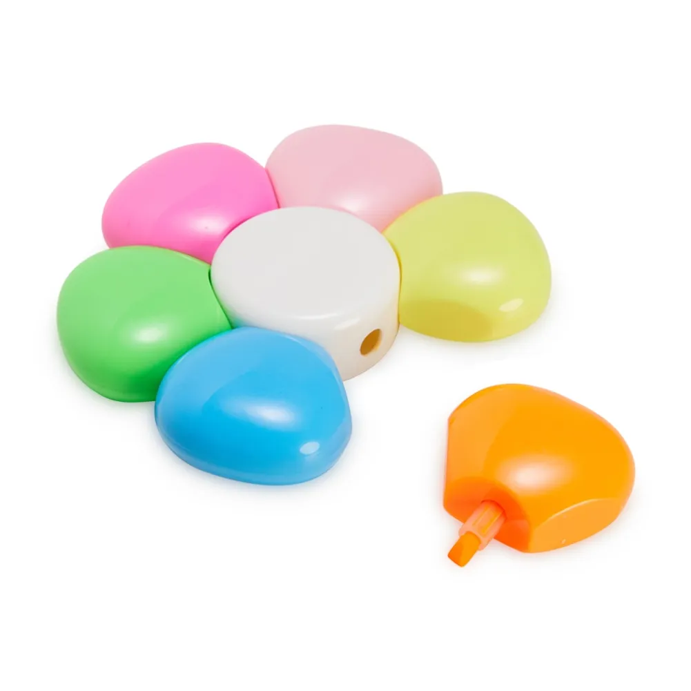 Caneta marca texto em formato Flor na cor branca de frente e verso liso, possui as cores: azul, verde, rosa, amarelo, laranja e rosa escuro.