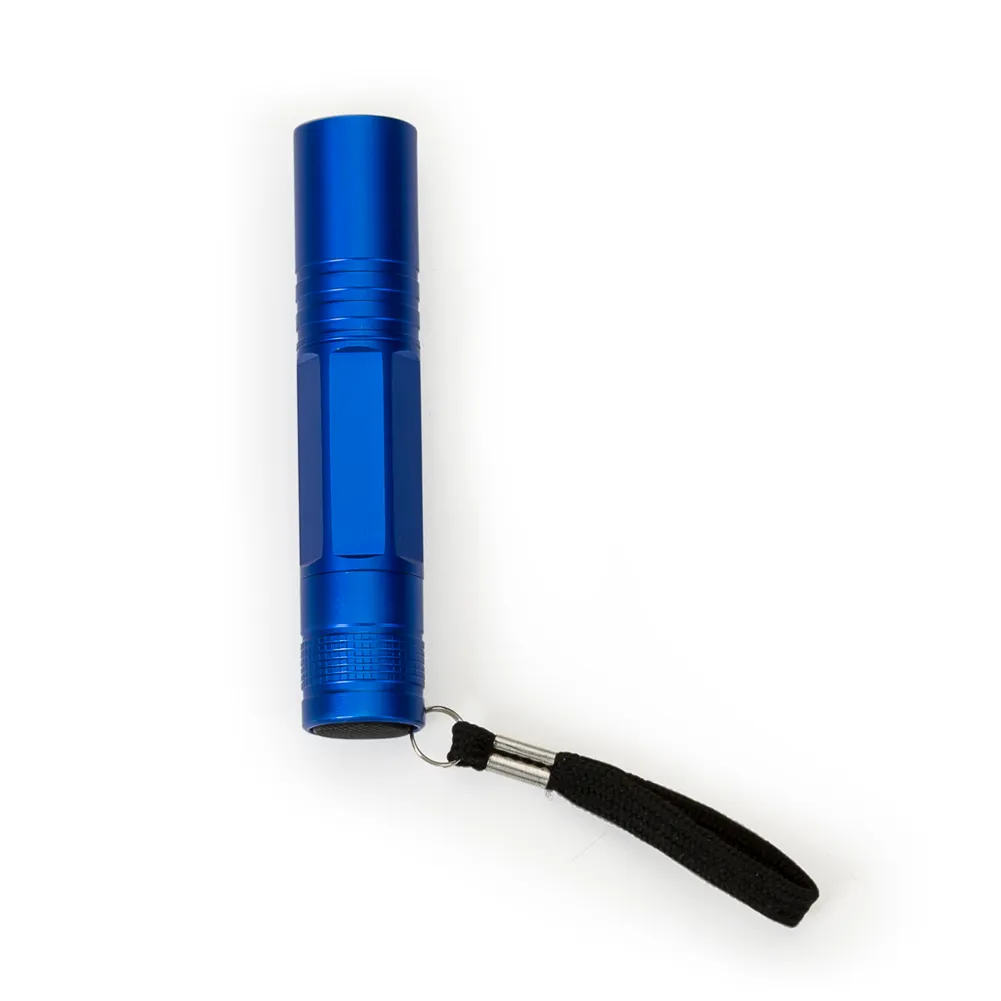 Mini lanterna de alumínio com cordão e um Led. Acionador emborrachado e cordão de nylon ficam na tampa de rosca(parte traseira), possui detalhes quadriculados em relevo. Centro possui seis detalhes retos ideais para personalização seguidos de três anéis em relevo. Utiliza uma pilha AA(não acompanha).