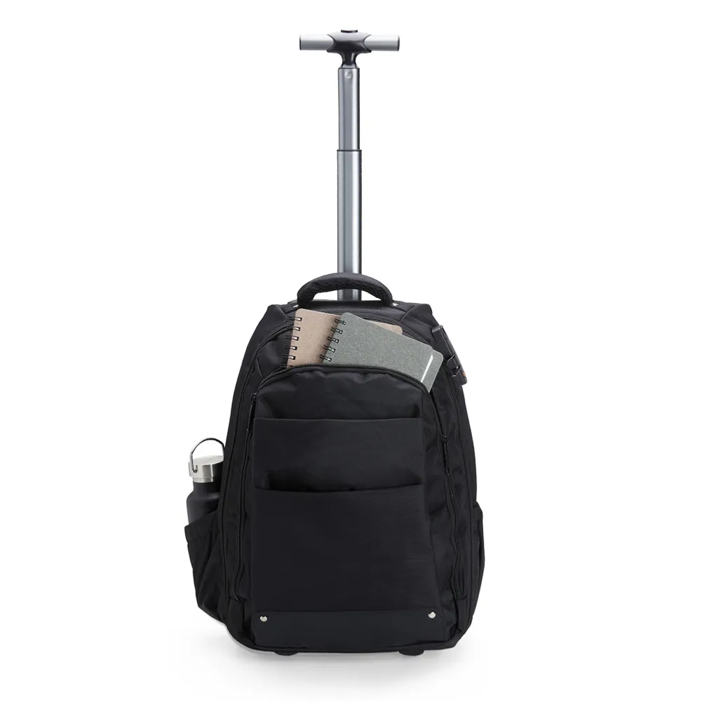 Mochila 27 litros com rodinhas e cadeado TSA. Possui padrão para bagagem de mão, conforme especificações ANAC (Agência Nacional de Aviação Civil) Confeccionada em nylon, contém alça revestida com espuma para um maior conforto, puxador retrátil com regulagem e botão acionador, alças para as costas escondidas no compartimento traseiro com zíper. Com 5 compartimentos, sendo um pequeno para carteira e canetas, dois medianos para documentos, bolsos nas laterais, bolso para notebook até 15,6 polegadas com divisórias para celular e forro com zíper. Possui duas rodinhas e freio em plástico, além de um sistema velcro para junção do compartimento das alças com a parte inferior, tampando as rodinhas enquanto transporta a mochila nas costas.