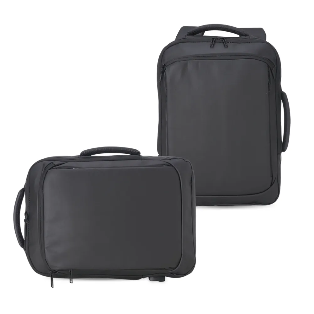 Mochila em couro sintético 17 litros resistente à água com cinco compartimentos, sendo o principal com bolso para notebook 156. Com divisórias internas para acessórios, a mochila possui suporte externo usb, alça para encaixe em malas de viagem e duas alças de mãos, sendo uma delas lateral para o transporte da mochila no modo pasta.