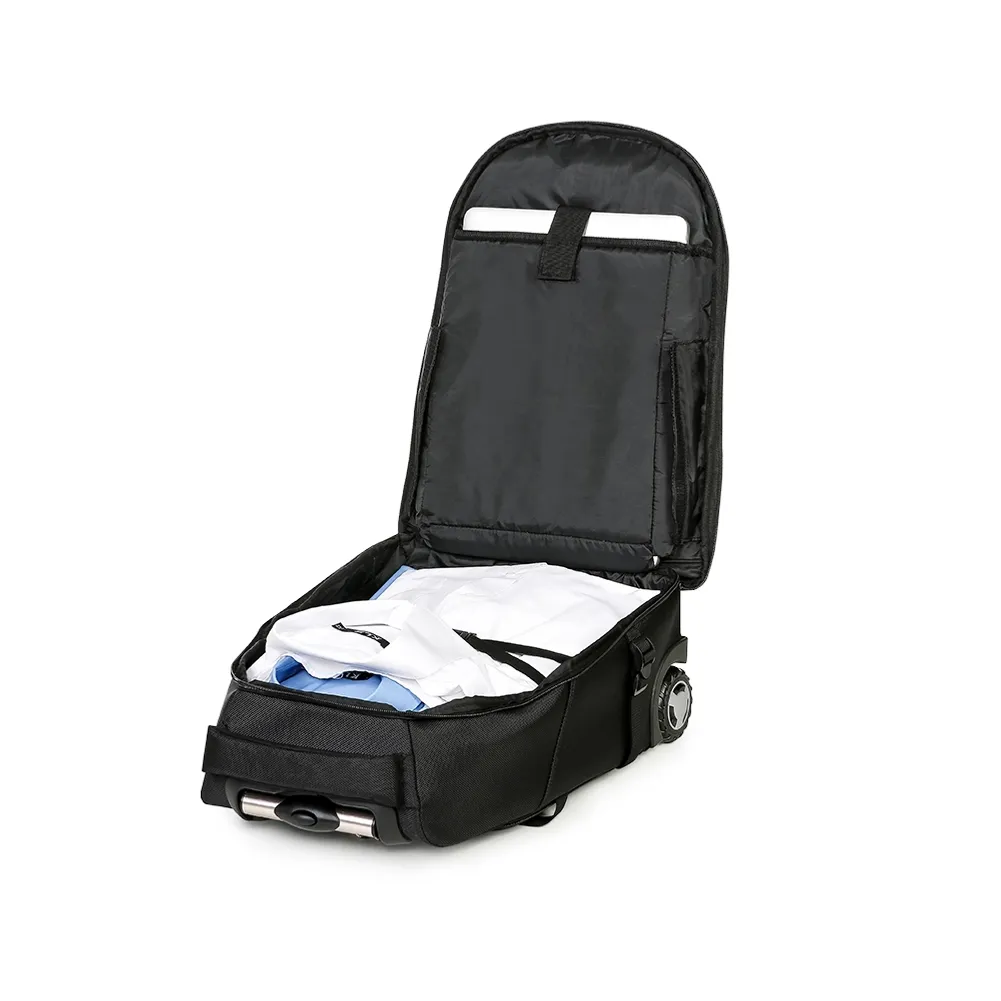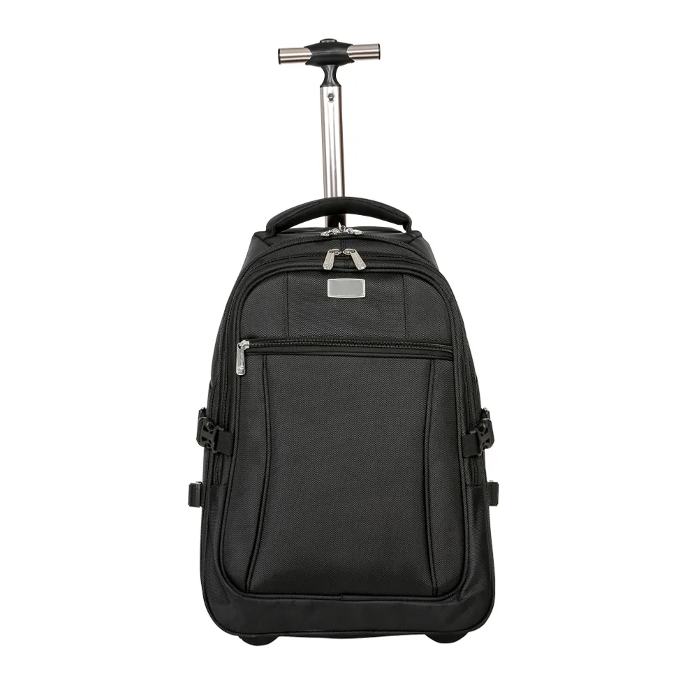 Mochila de carrinho confeccionada em nylon, contém puxador retrátil de alumínio com botão acionador, alça de mão com revestimento espumado, alças para as costas reguláveis com revestimento espumado e fivelas para regulagem peitoral, fivelas laterais para compressão, rodinhas e freios em pvc. Compartimento principal com porta notebook (até 14 polegadas), suporte USB com cabo acoplado para saída externa, fita compressora para vestuário, fechos laterais internos com velcro e fundo com placa de pvc; compartimento traseiro para retenção das alças de costas com “liga” de velcro e “capas” embutidas para as rodinhas; compartimento mediado com divisória em tela; compartimento frontal e bolsos laterais de malha. Acompanha plaquinha metálica imantada.