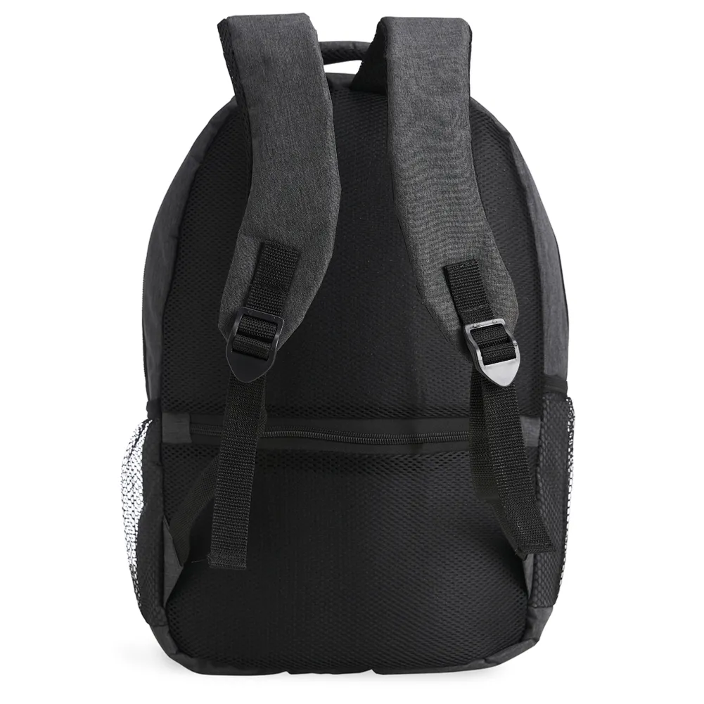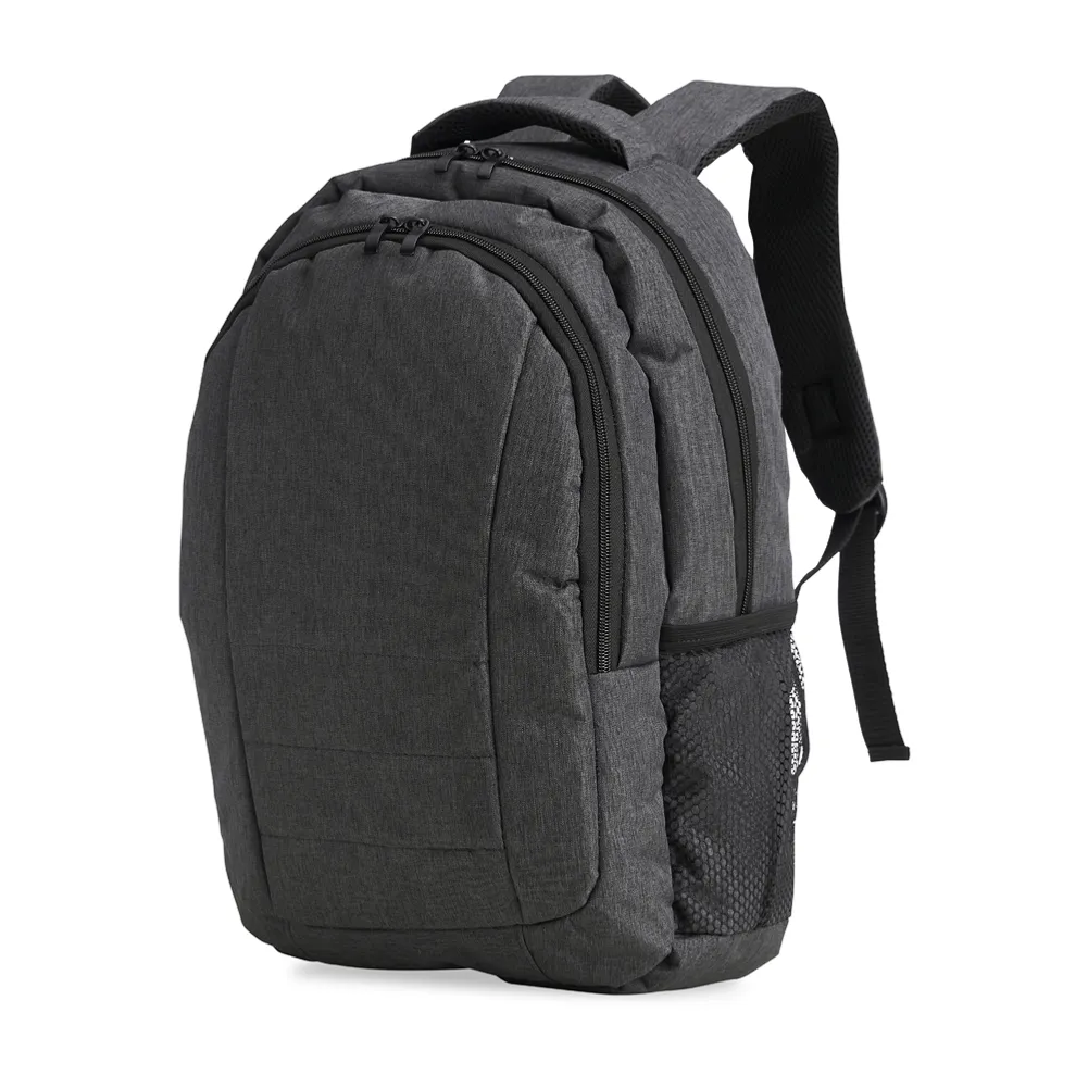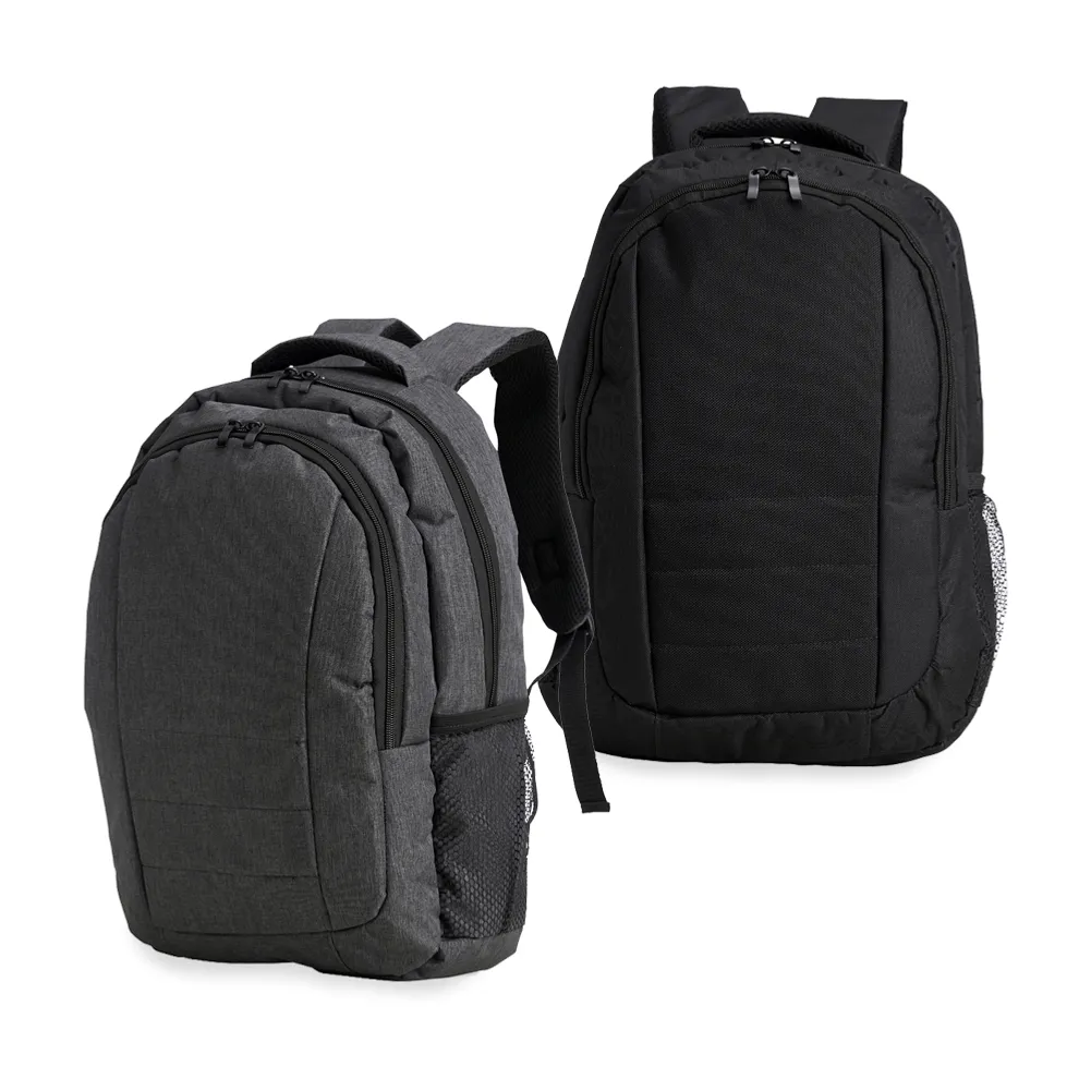 Mochila de nylon e oxford 26 litros com 3 compartimentos, sendo o principal com bolso para notebook 15’6 com fecho de velcro, compartimento mediano frontal com divisórias internas e compartimento na área costada. Contém bolsos laterais telados, alça de mão, alça de costas e área costada com revestimento espumado.