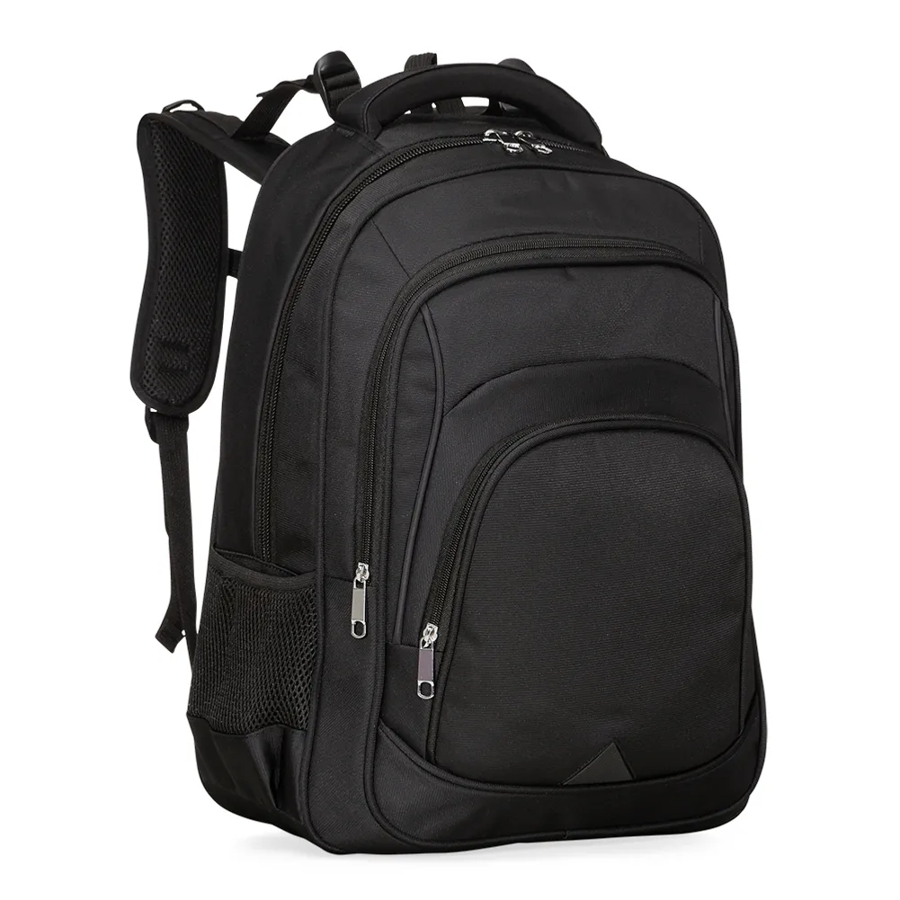 Mochila de poliéster 42 litros com três compartimentos, sendo o principal com bolso para notebook 156. Com divisórias internas para acessórios, a mochila possui bolsos laterais em malha, alça para encaixe em malas de viagem, alças de compensação, duas alças de mãos e área costada com revestimento espumado. Acompanha plaquinha metálica.