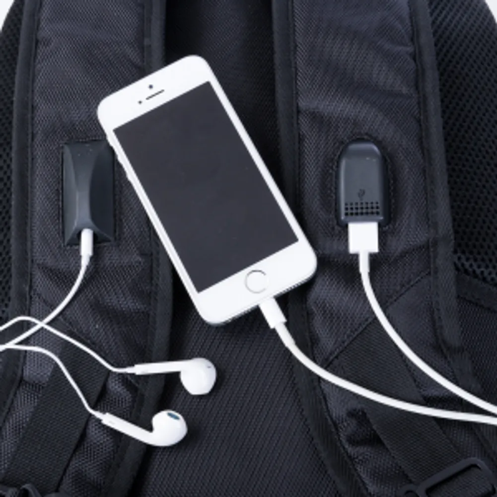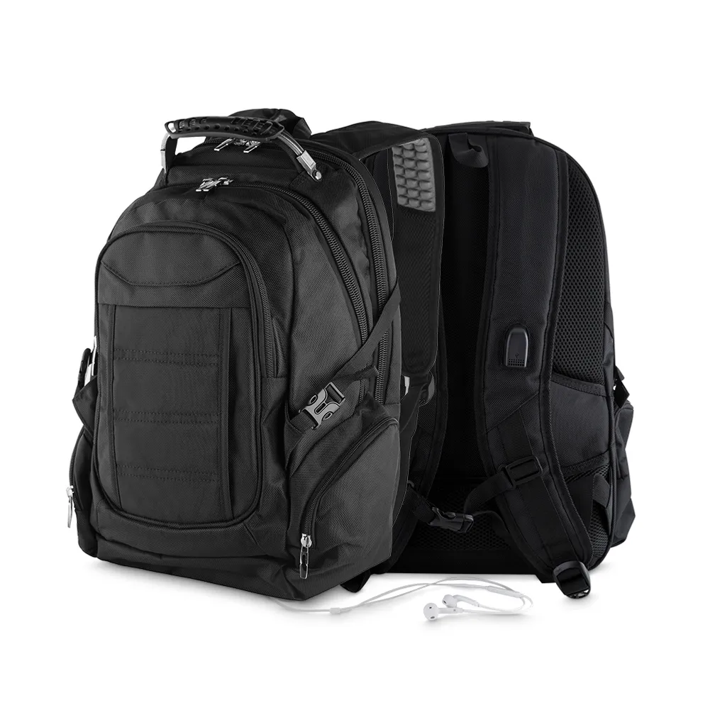 Mochila p/ notebook em tecido poliéster. Parte Externa: Alça de mão com cabo de aço e pegador emborrachado. Bolso frontal, dois bolsos laterais. Saída para fone de ouvido e USB. Forro de costas acolchoado. Engate para mala de viagem. Parte Interna: Compartimento acolchoado p/ notebook 29x46cm. Tamanho total do Notebook - 18¨ Porta documentos e caneta. Obs.: Não acompanha a placa metálica p/ gravação.