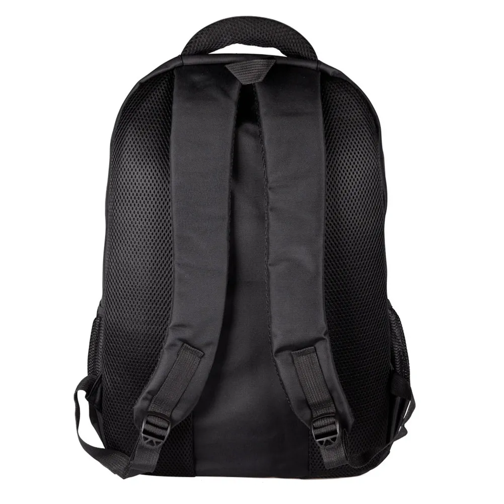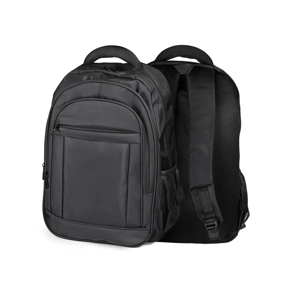 Mochila p/ Notebook em tecido poliéster. Parte externa: 3 Bolsos frontais com ziper; 2 Bolsos laterais; Alça de mão e ombro acolchoadas. Parte interna: Compartimento para notebook. Tamanho total do Notebook - 18¨ Dimensão do Produto: 19x34x49cm Peso do Produto: 1kg Quant. por Caixa: 10pçs Embalagem: Saco plástico Dimensão da Caixa: 52x35x40cm Peso da Caixa: 11kg