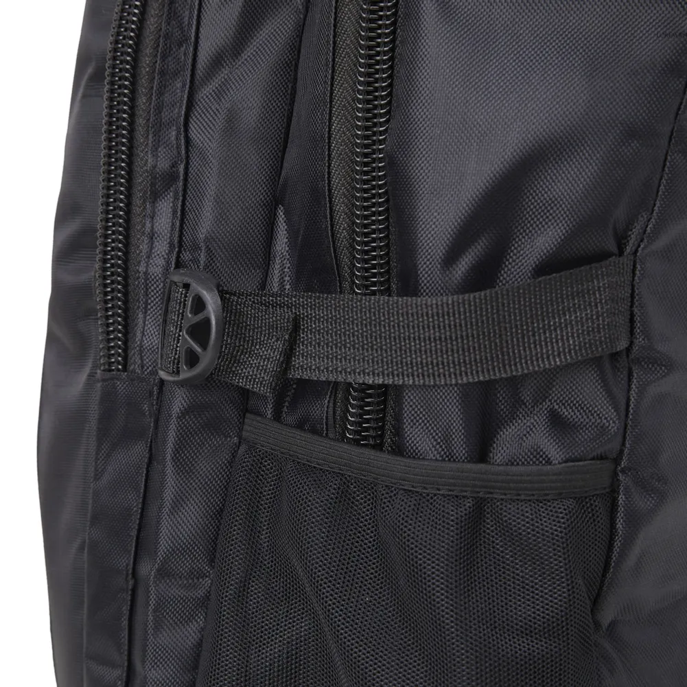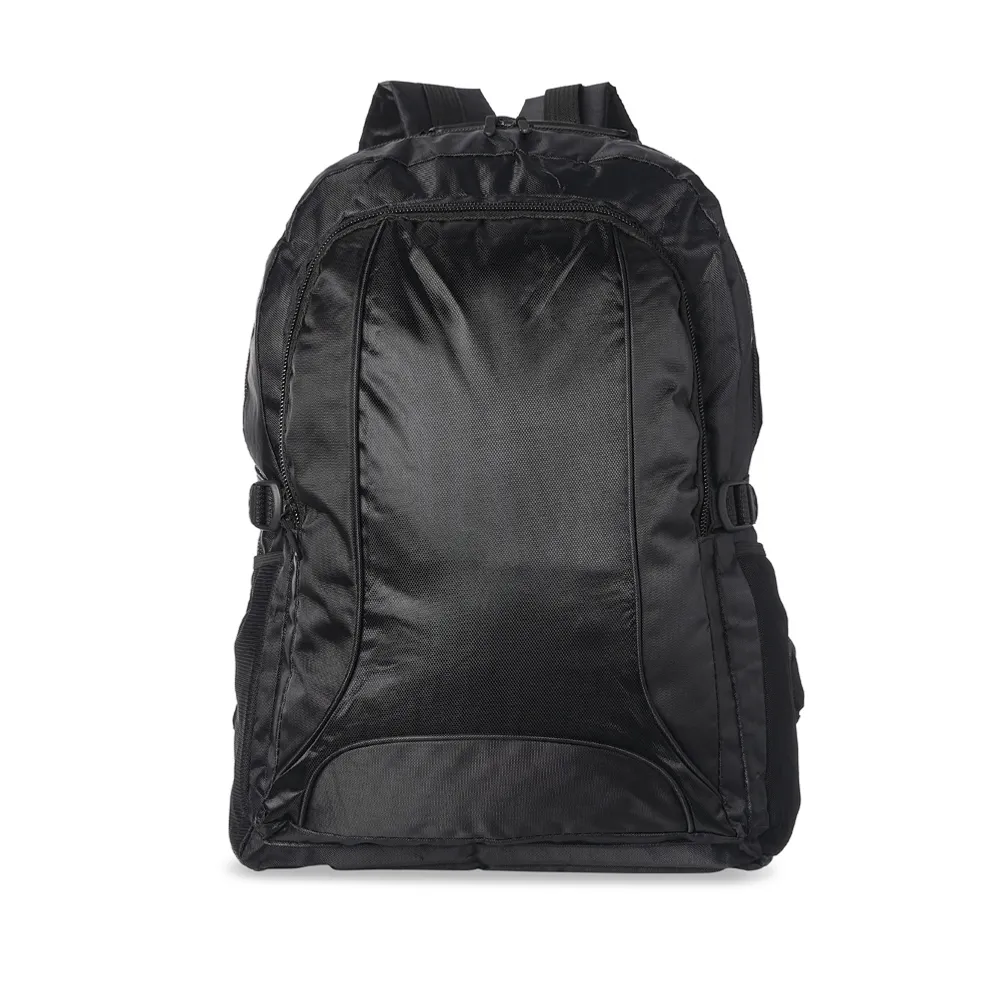 Mochila de nylon 42 litros com dois compartimentos e bolsos laterais em malha. Possui fivelas laterais para regulagem de tamanho e duas alças de mãos, sendo uma delas reforçada com pegador plástico.