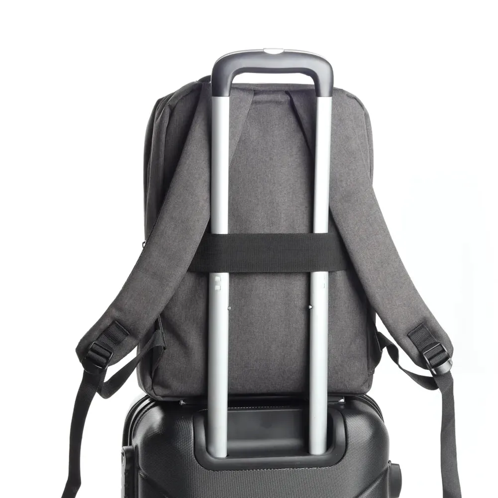 Mochila p/ Notebook em tecido poliéster. Parte externa: Bolso frontal com ziper. Bolso pequeno na lateral direita. Conector USB. Alça de mão. Alça de ombro acolchoada. Engate para mala de viagem. Parte interna: Compartimento acolchoado p/ notebook até 15 polegadas. Porta caneta. Porta objeto Dimensão do Produto: 13x32x44cm Peso do produto: 0,680kg Quant. por Caixa: 16pçs Embalagem: Saco TNT branco + Saco plástio ziplock Dimensão da Caixa: 65x45x35 Peso da Caixa: 12,3kg