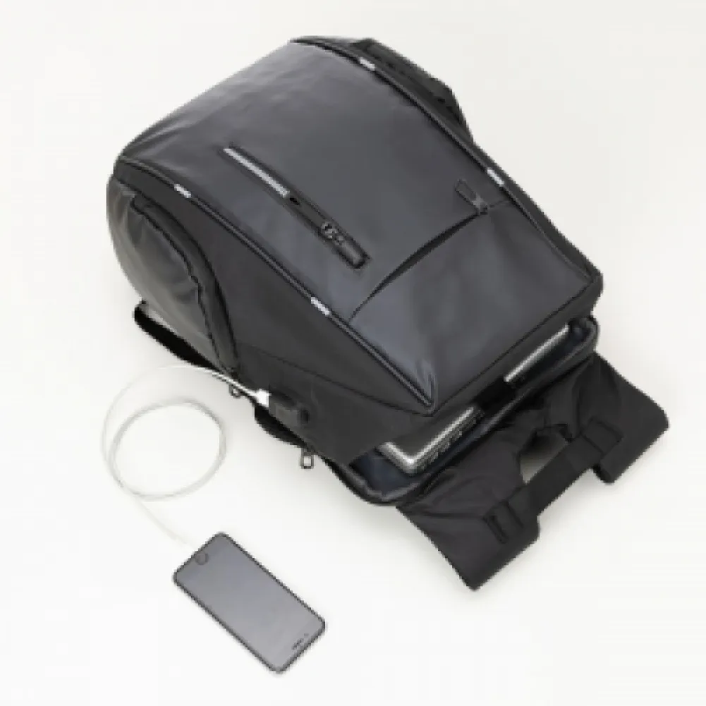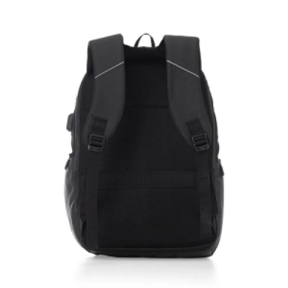 Mochila confeccionada em poliéster com compartimento para notebook. Contém compartimento grande com bolso para notebook até 17 polegadas, compartimento mediano com zíper bolso frontal com zíper, alça de mão, alça superior em nylon, alças de ombro e costas acolchoada com revestimento antitranspirante, bolsos laterais com zíper e porta USB lateral. Tecido impermeável.