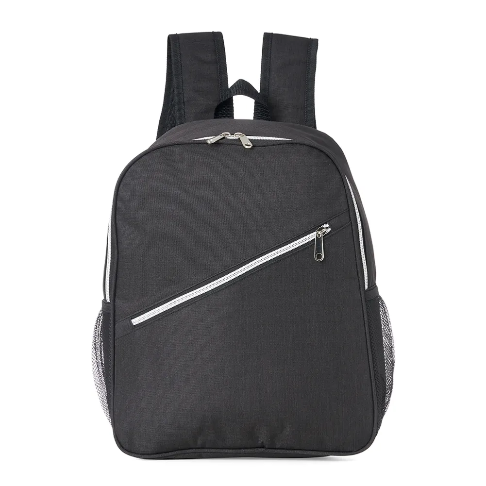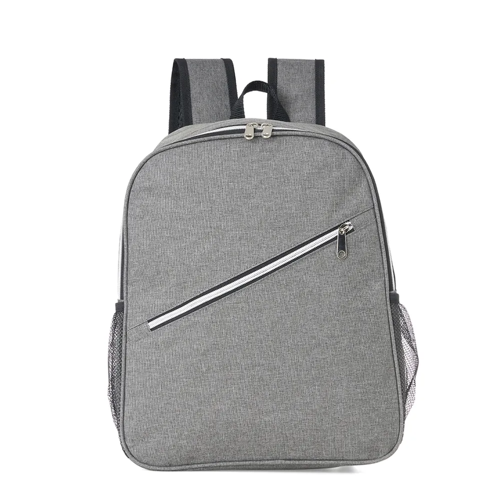 Mochila térmica de poliéster 15 litros com dois compartimentos e bolsos laterais em malha. Compartimento principal com revestimento térmico.