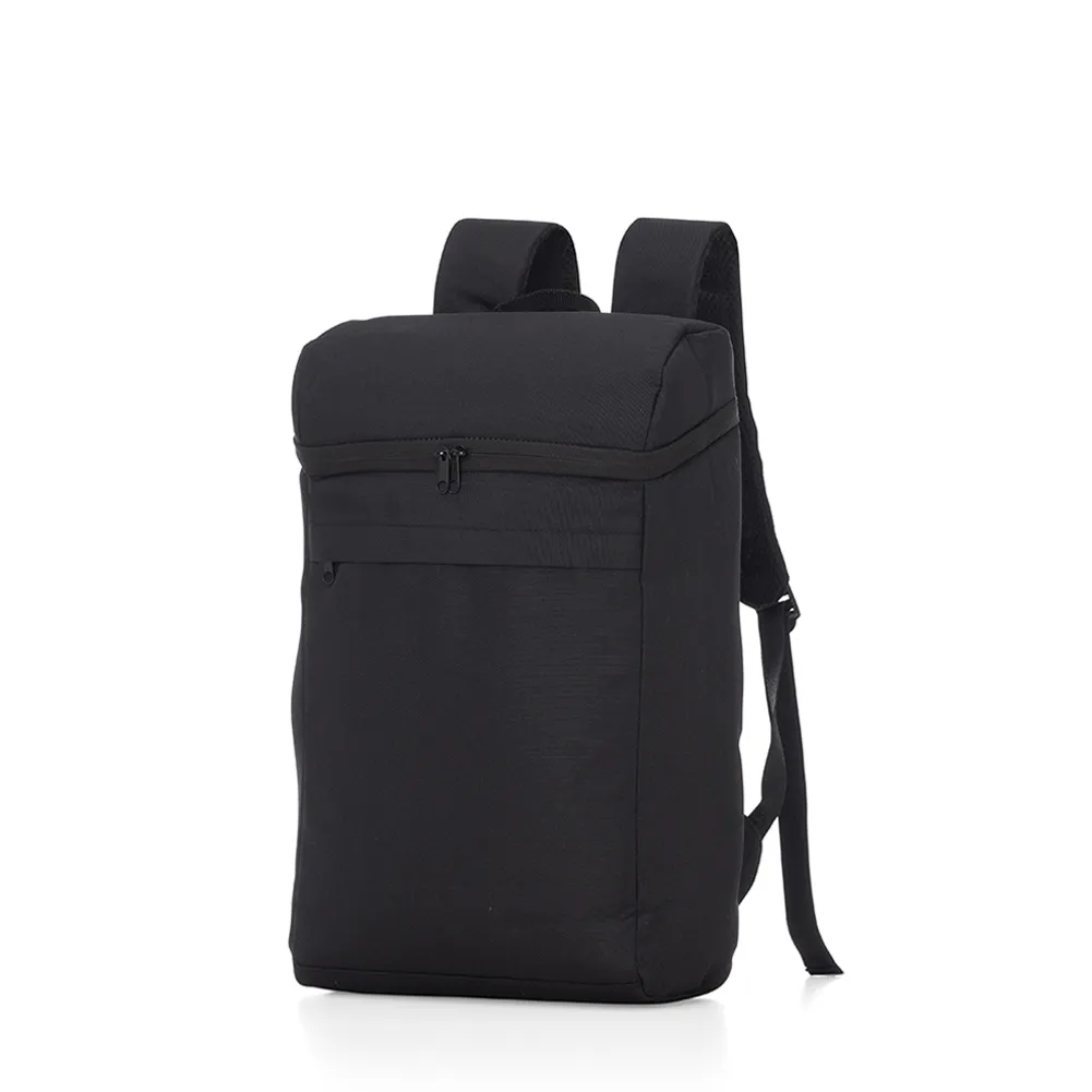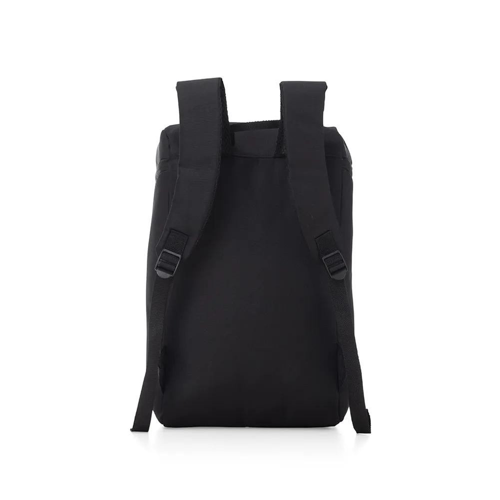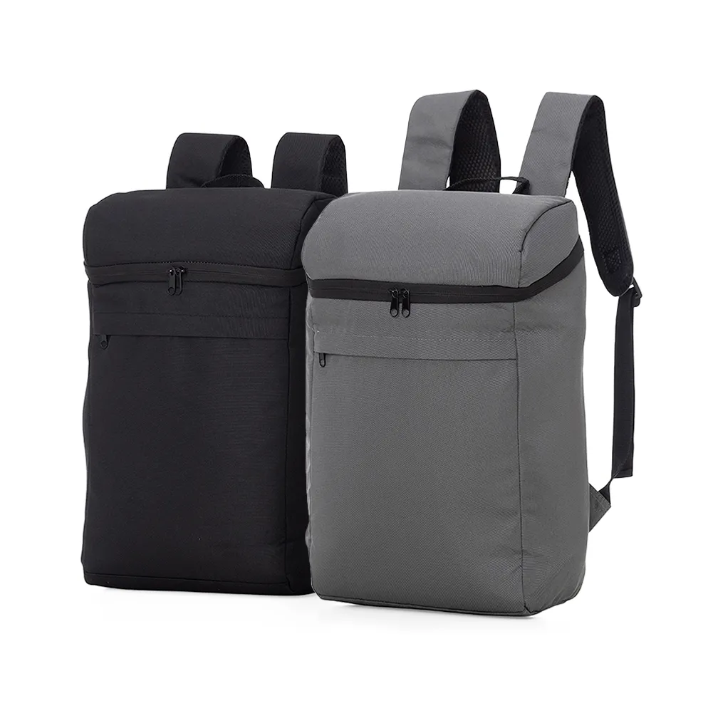 Mochila térmica 17L confeccionada em poliéster, possui bolso frontal com zíper, alça para as mãos em nylon, e alça para as costas ajustáveis com revestimento antitranspirante