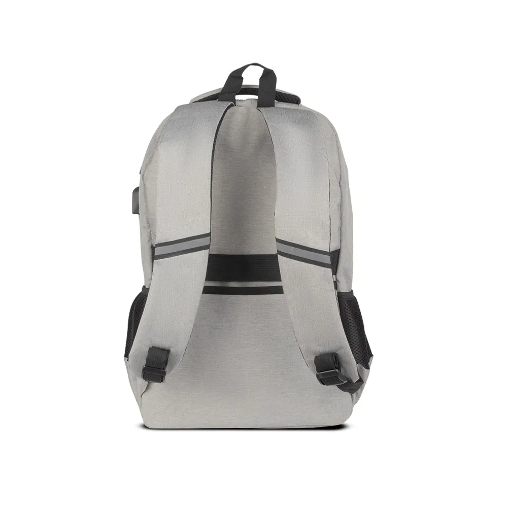 Mochila p/ notebook em tecido PET RECICLÁVEL com compartimento térmico. Parte externa: Dois bolsos laterais. Bolso central. Bolso traseiro. Alça de mão e engate para mala de viagem Parte interna: Compartimento acolchoado p/ Notebook Compartimento térmico ideal para transportar alimentos Dimensão do produto: 50x37x19cm Peso do produto: 0,766kg