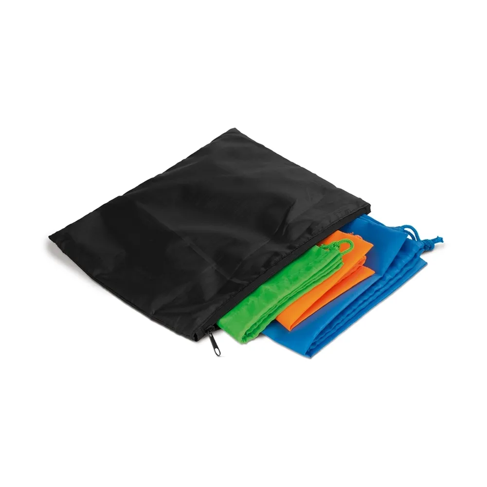 Conjunto com 4 sacolas coloridas de tamanhos diferentes para organizar bagagem.