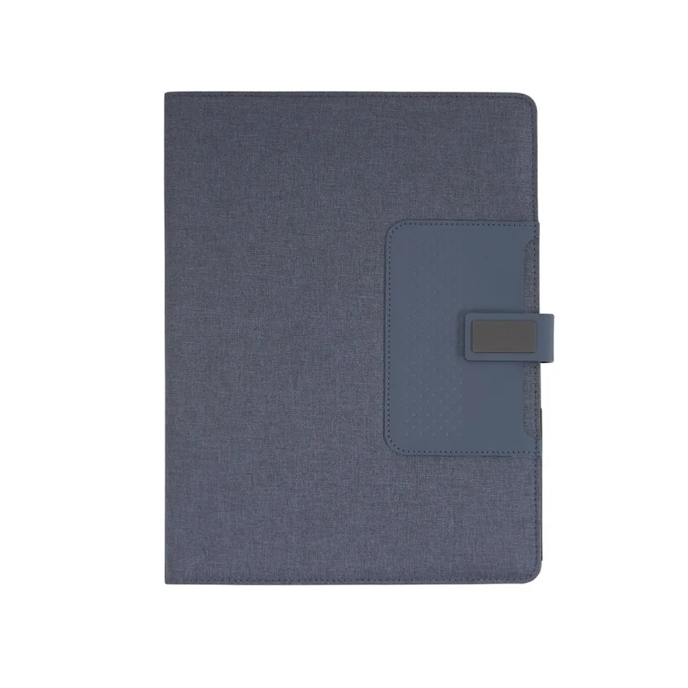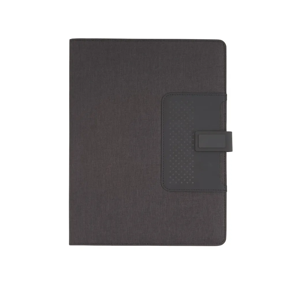 Pasta convenção com bloco para anotações. Pasta confeccionada em material sintético, possui fecho imantado com plaquinha emborrachada, “bolso” interno para arquivar documentos, suporte para cartões, celulares e caneta, além de um bloco com folhas brancas pautadas de aproximadamente 22 folhas.