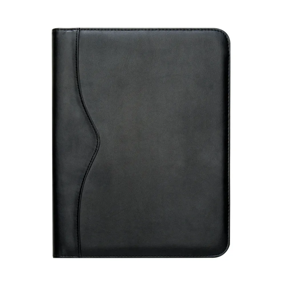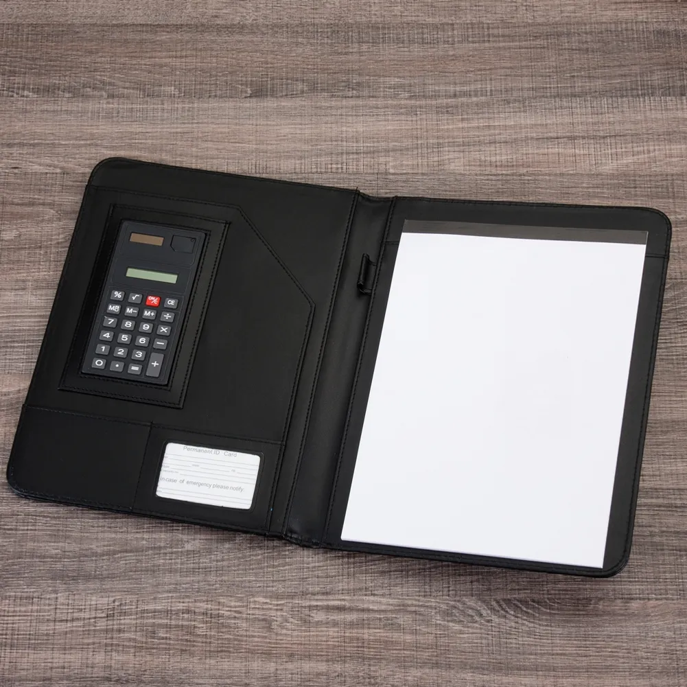Pasta convenção de couro sintético, possui calculadora solar plástica de 8 dígitos, suporte para cartão, suporte com visor para cartão de identificação, suporte para arquivar documentos, suporte para caneta(não acompanha caneta) e bloco com 20 folhas pautadas.
