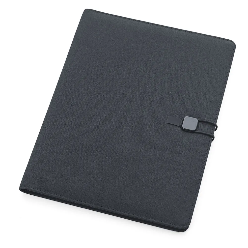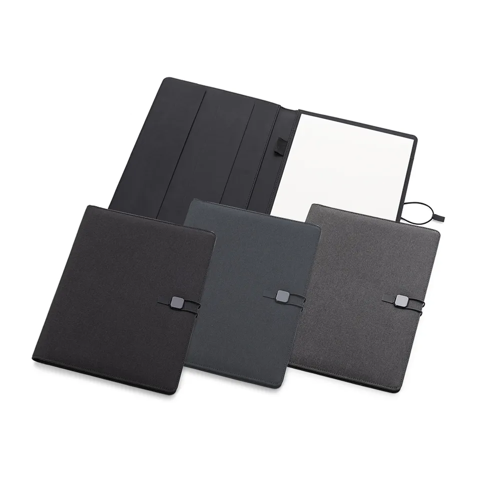Pasta executiva com capa almofadada em tecido poliéster, contendo: Bloco de anotações com 20 folhas; Porta Canetas; Porta Documentos; Porta Cartões.