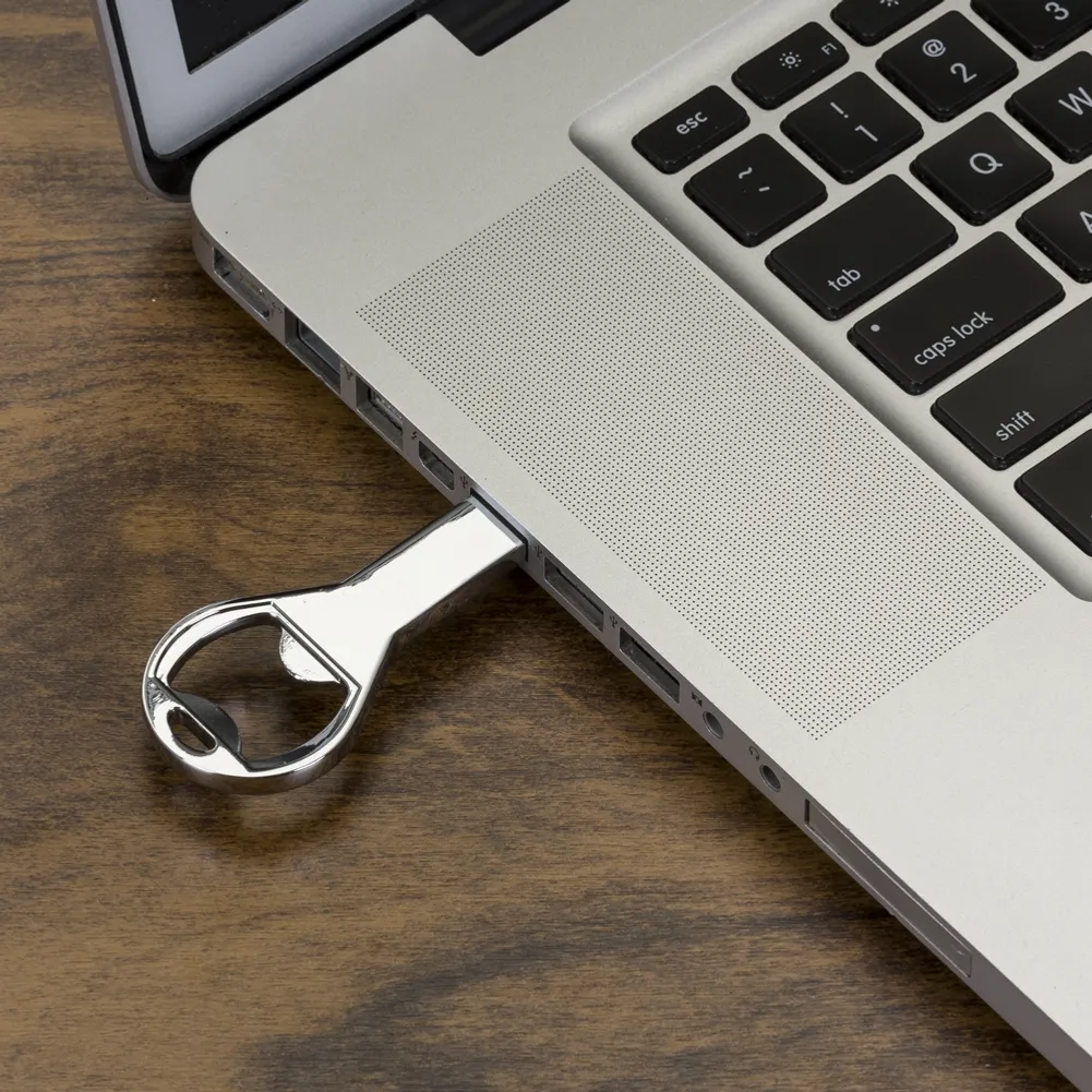 Pen drive de metal 4GB com abridor, parte superior possui um “furo” que pode ser utilizado para colocar algum cordão.