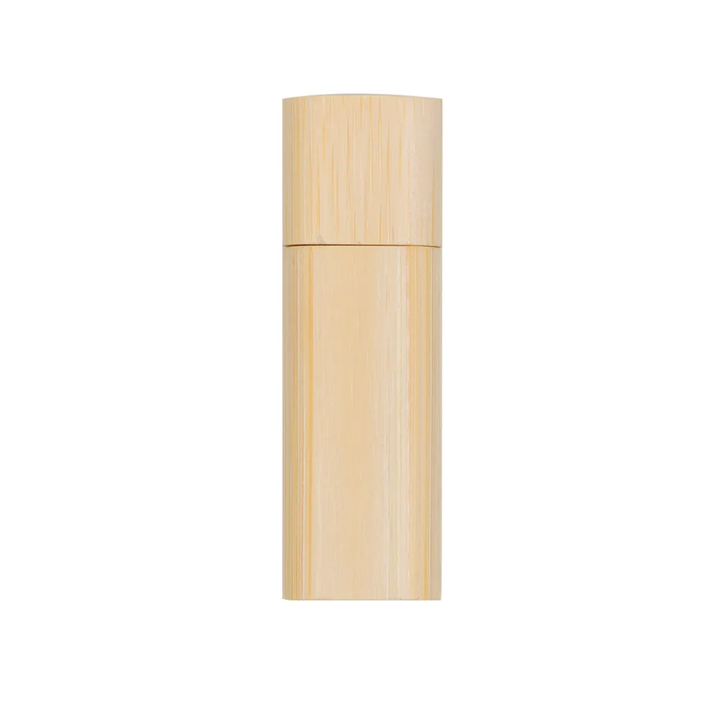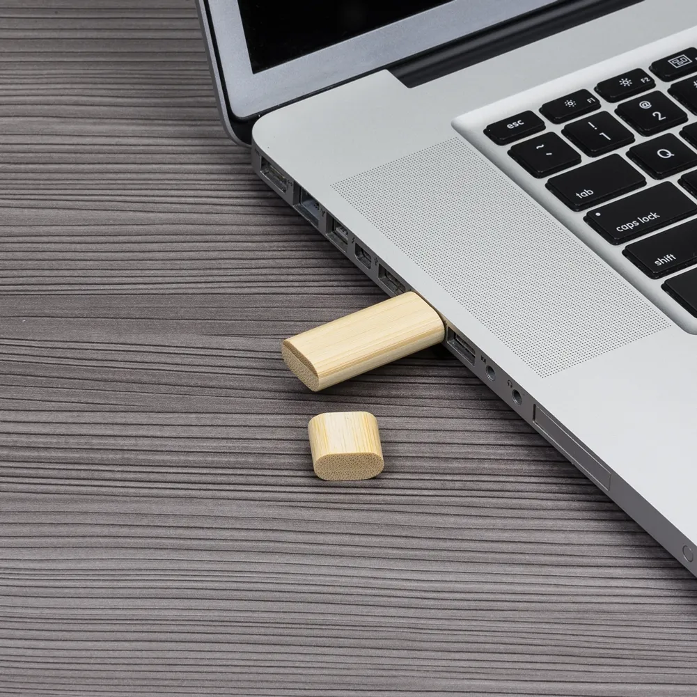 Pen drive de bambu 4gb, formato retangular porém as pontas e laterais são arredondadas. Tampa com imã.