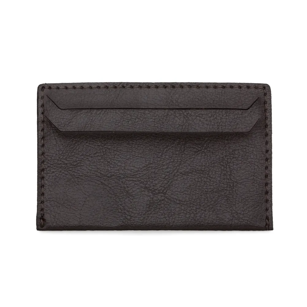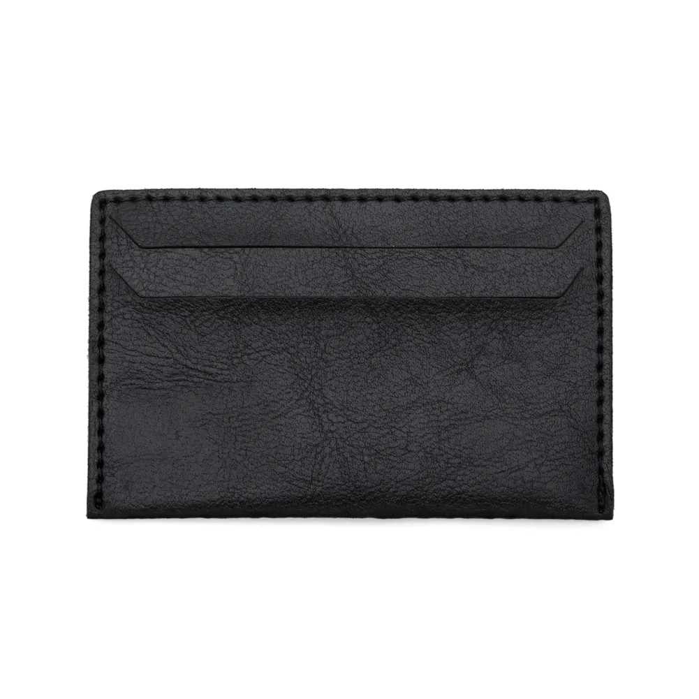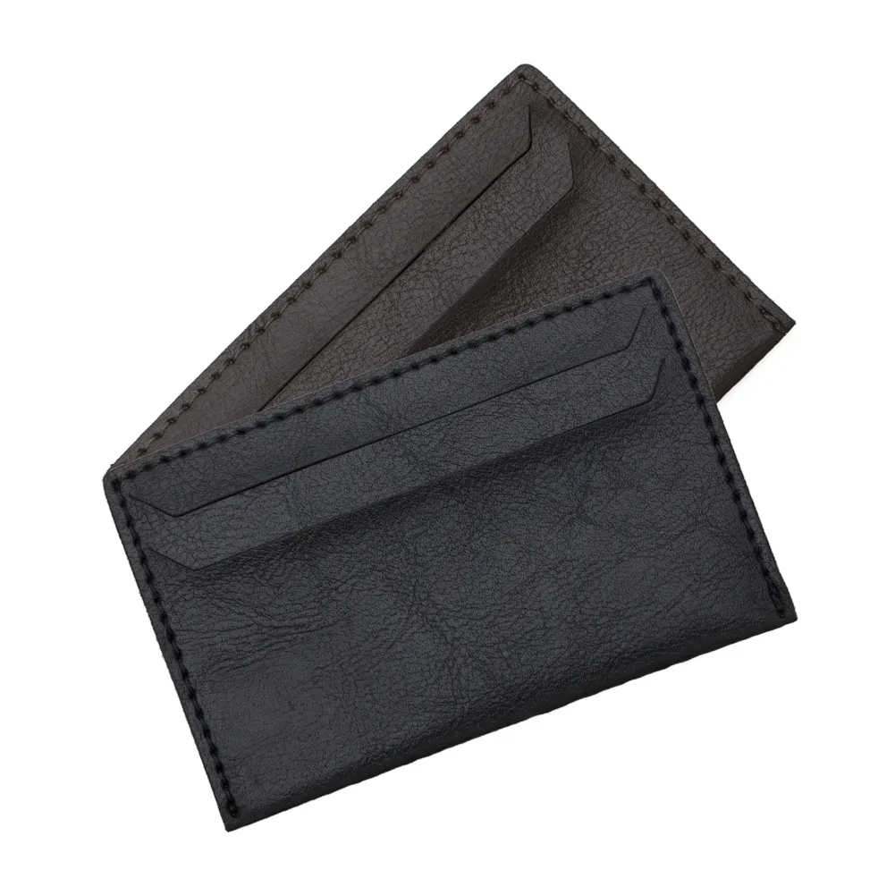 Porta cartão em couro sintético com duas divisórias frontais, verso liso.