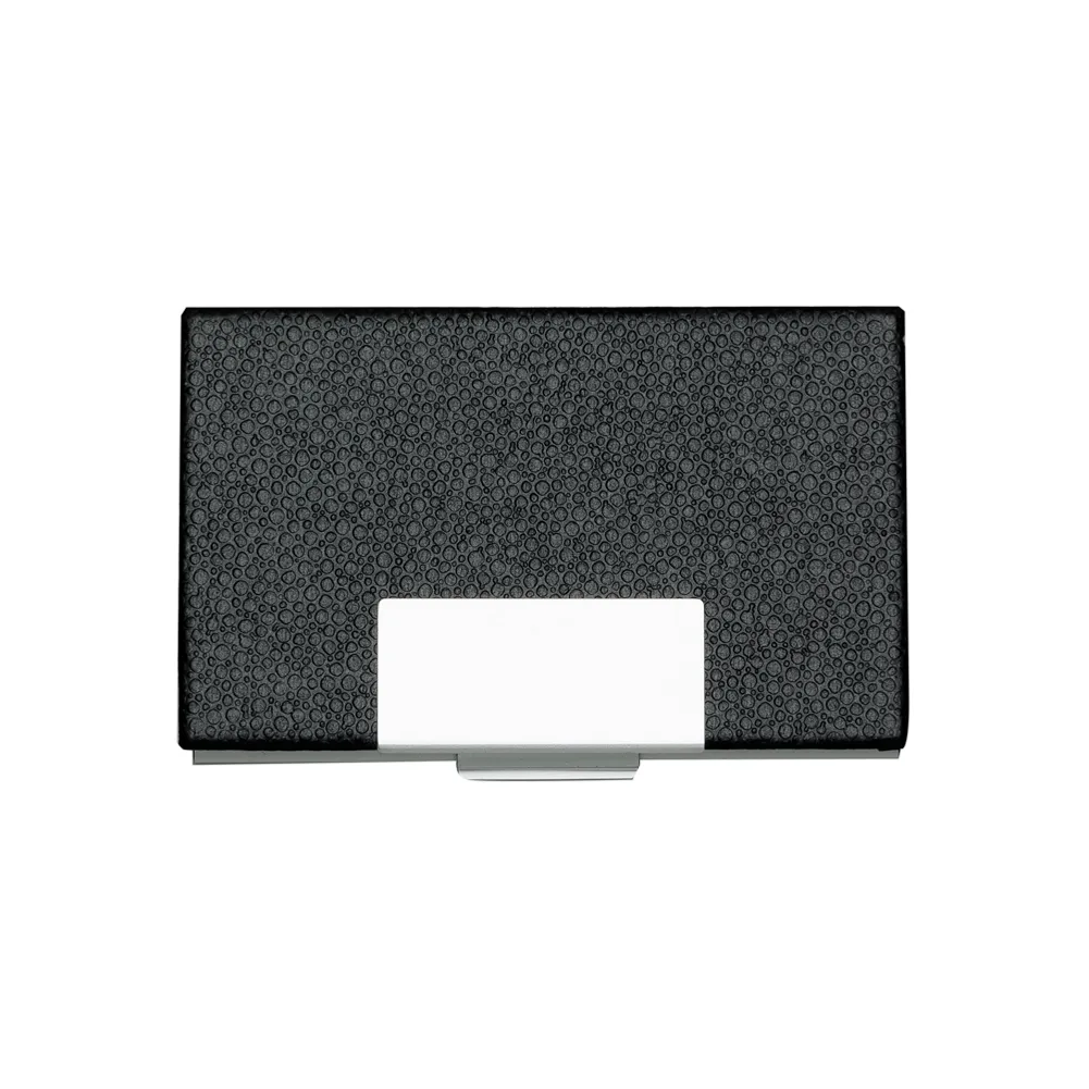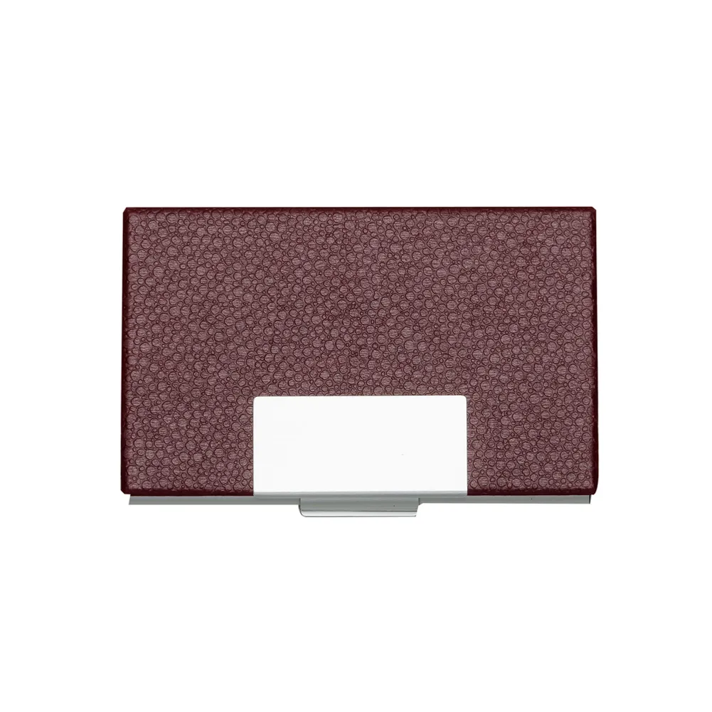 Porta cartão em couro sintético com detalhes em prata. Possui chapa central em metal para gravação, parte interna e traseira em alumínio.