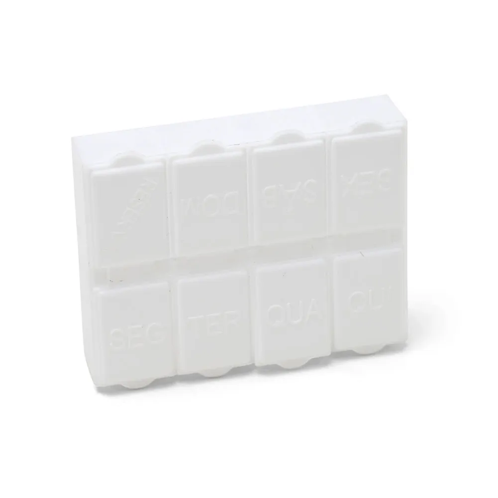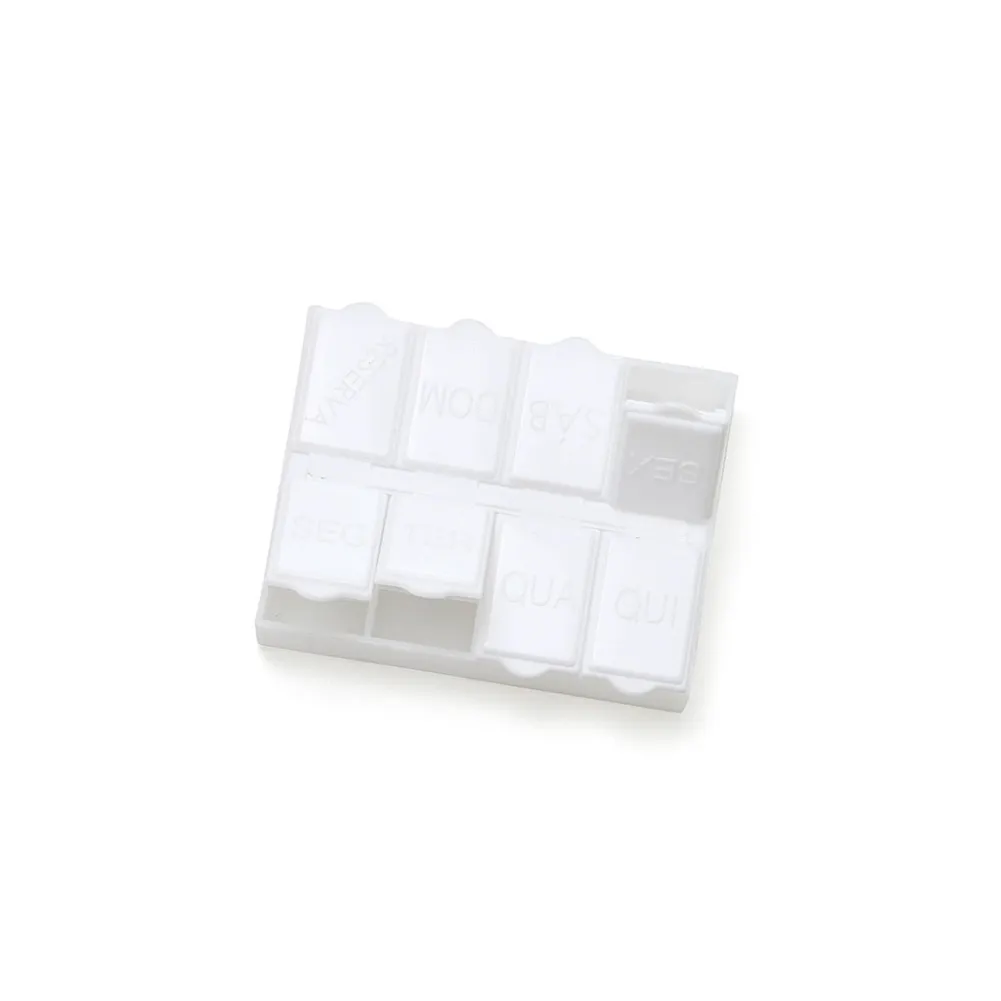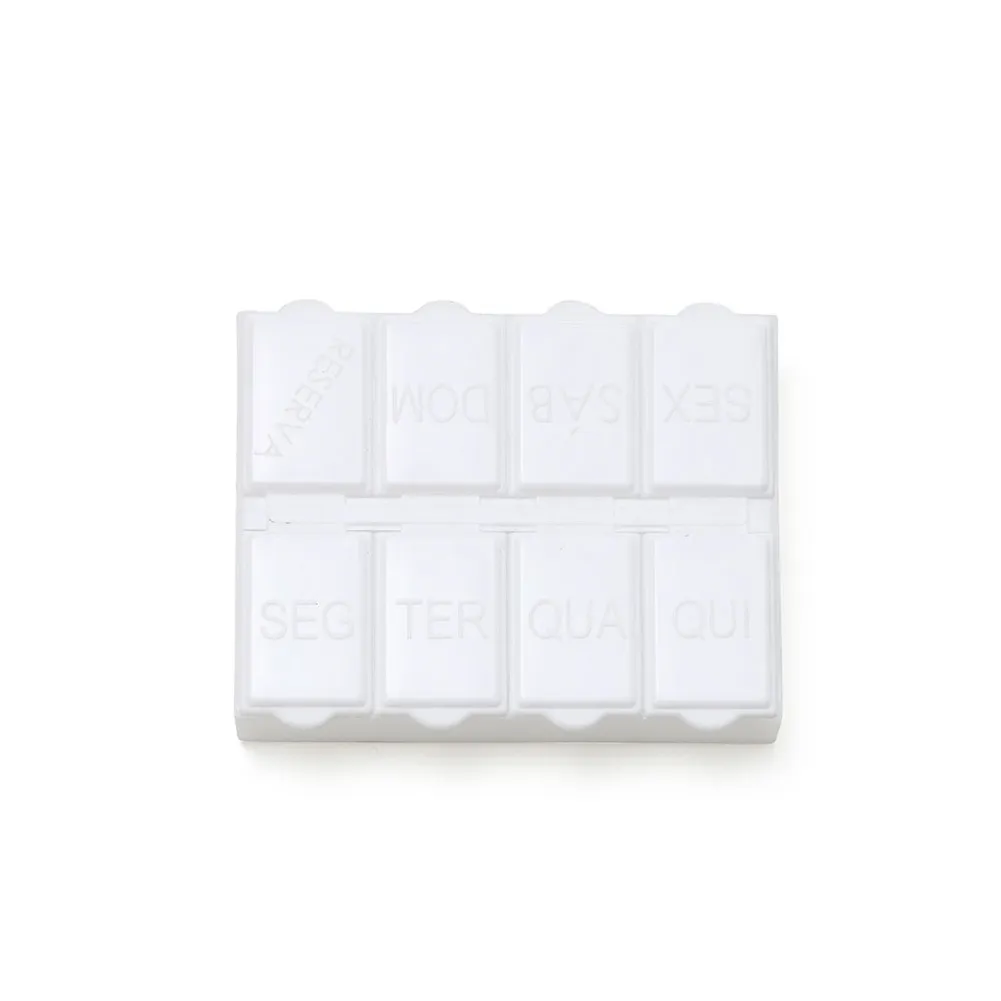 Porta comprimidos semanal de plástico branco fosco. Possui oito divisórias, sete delas escrito em relevo os dias da semana e a última escrito "reserva". Verso liso. OBS.: PEDIDO MÍNIMO DE 50 PEÇAS!
