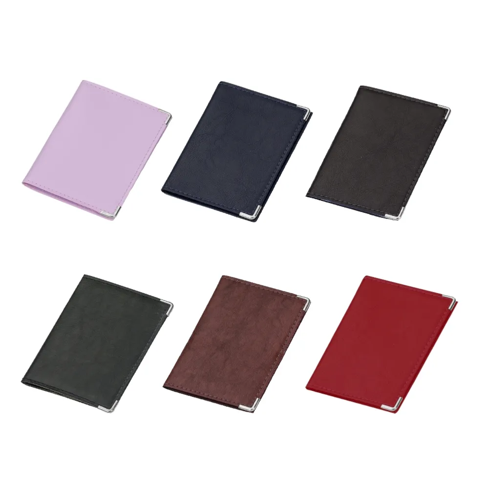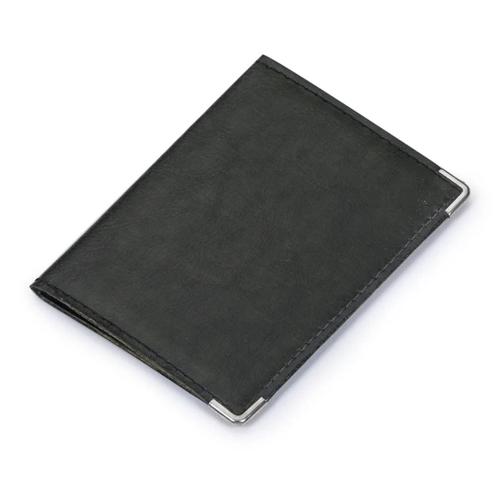 Porta documento em couro sintético com cantoneira prata, possui 4 divisórias plásticas grande e duas divisórias pequenas.