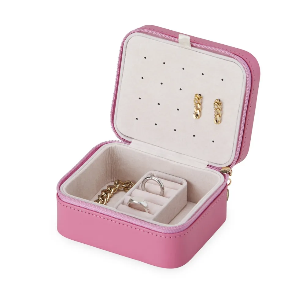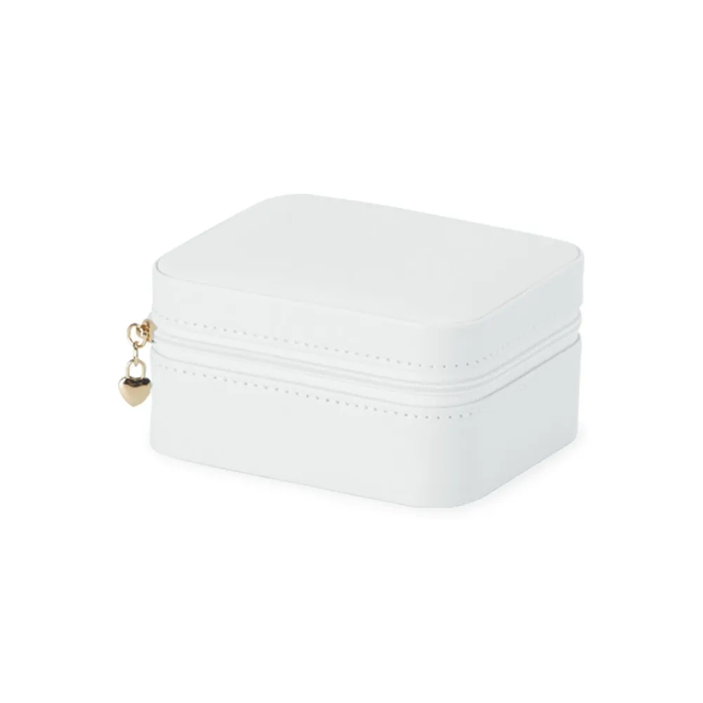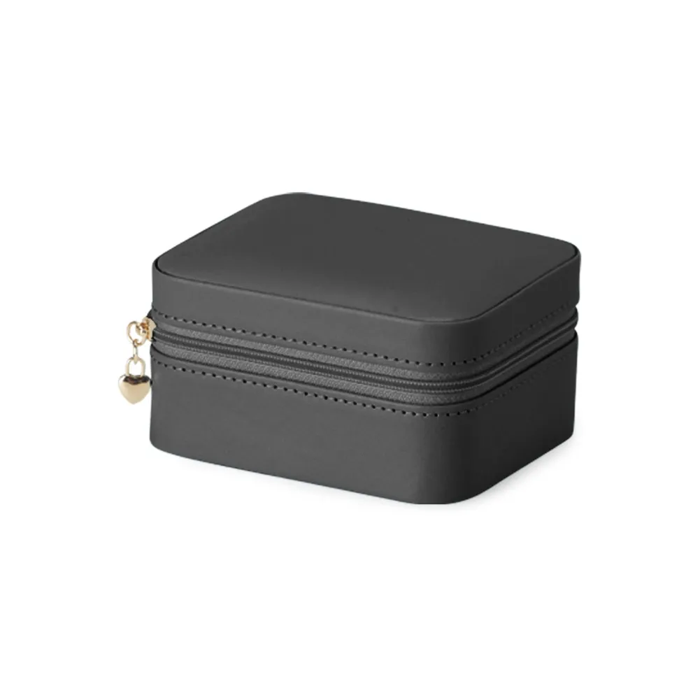 Porta joias de couro sintético com revestimento aveludado. Possui compartimentos internos para anéis, brincos, pulseiras e colares.