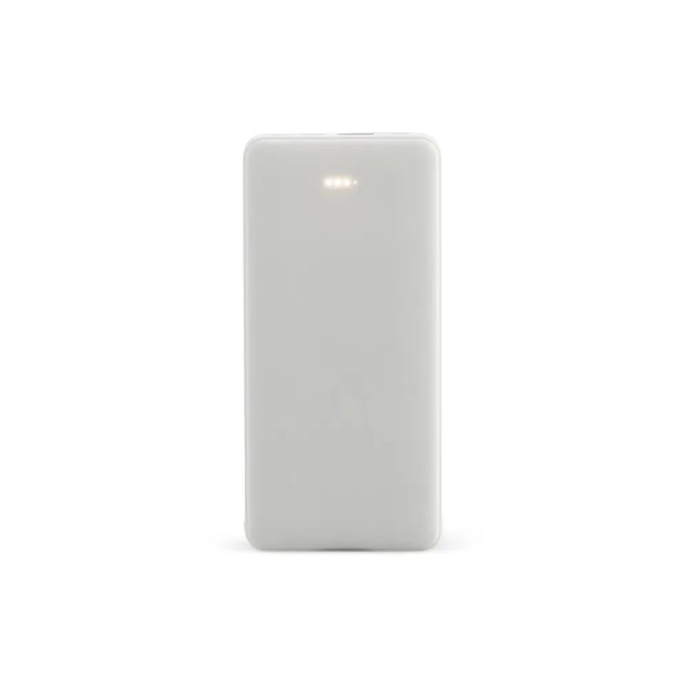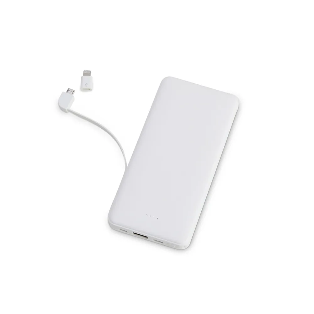Power bank plástico de 10.000mAh com indicadores led de bateria e cabos acoplados: Tipo-C e V8. Acompanha cabo USB V8 e adaptador Lightning.