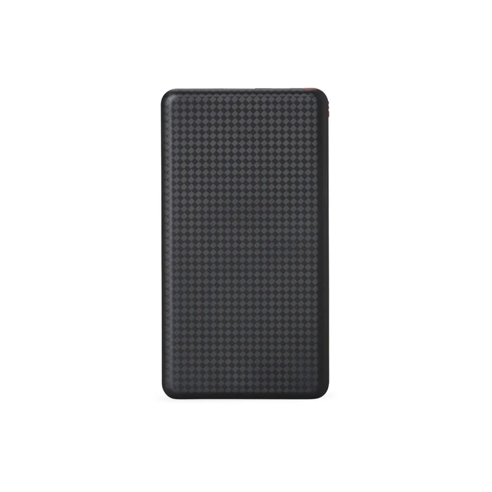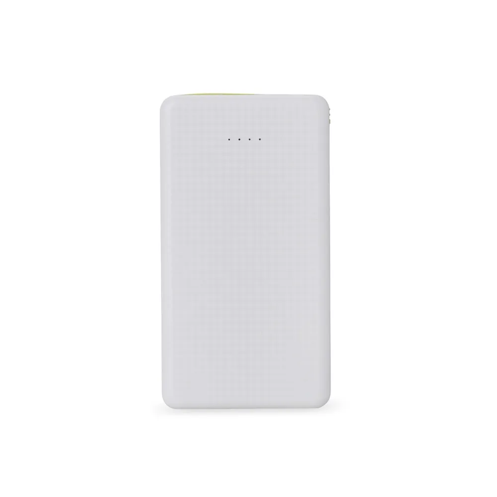 Carregador portátil plástico com 5.000mAh e indicador led de bateria. Possui entrada V8, acompanha cabo USB, adaptador lightning e adaptador tipo-C.