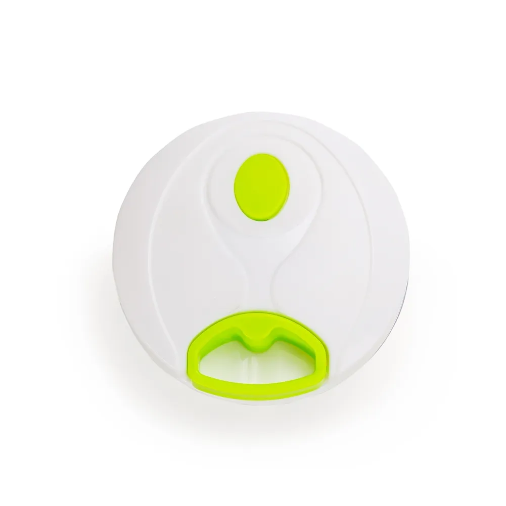 Processador de alimentos manual, tampa plástica de polipropileno com puxador verde, pote transparente em poliestireno com relevo e lâminas em aço inox.
