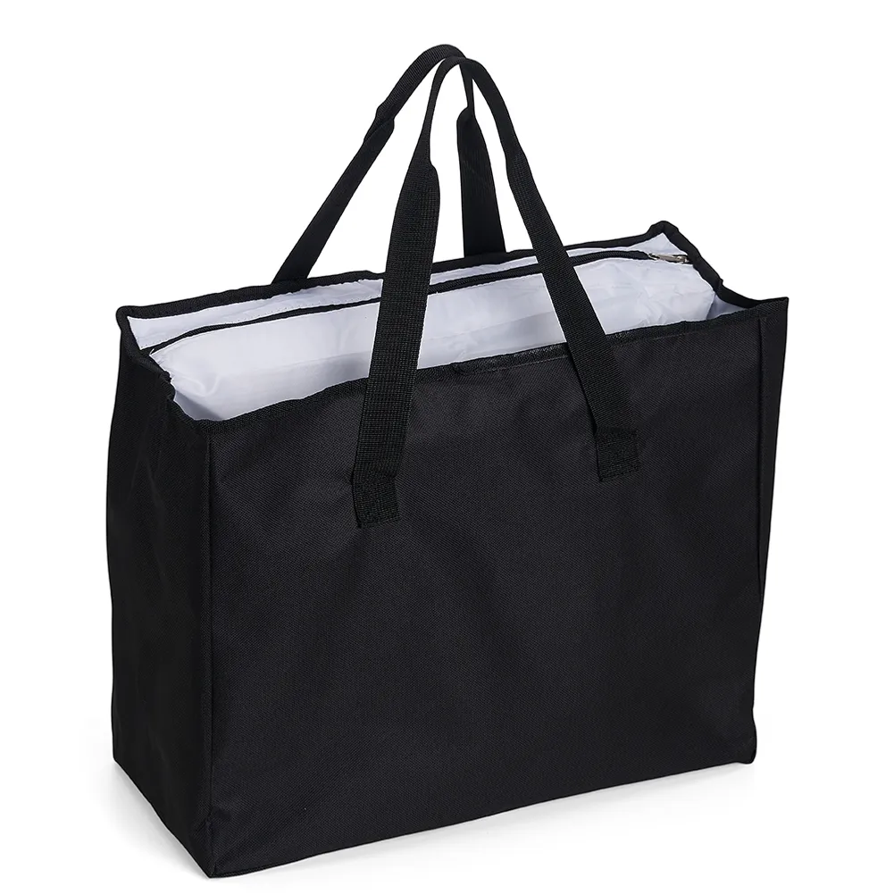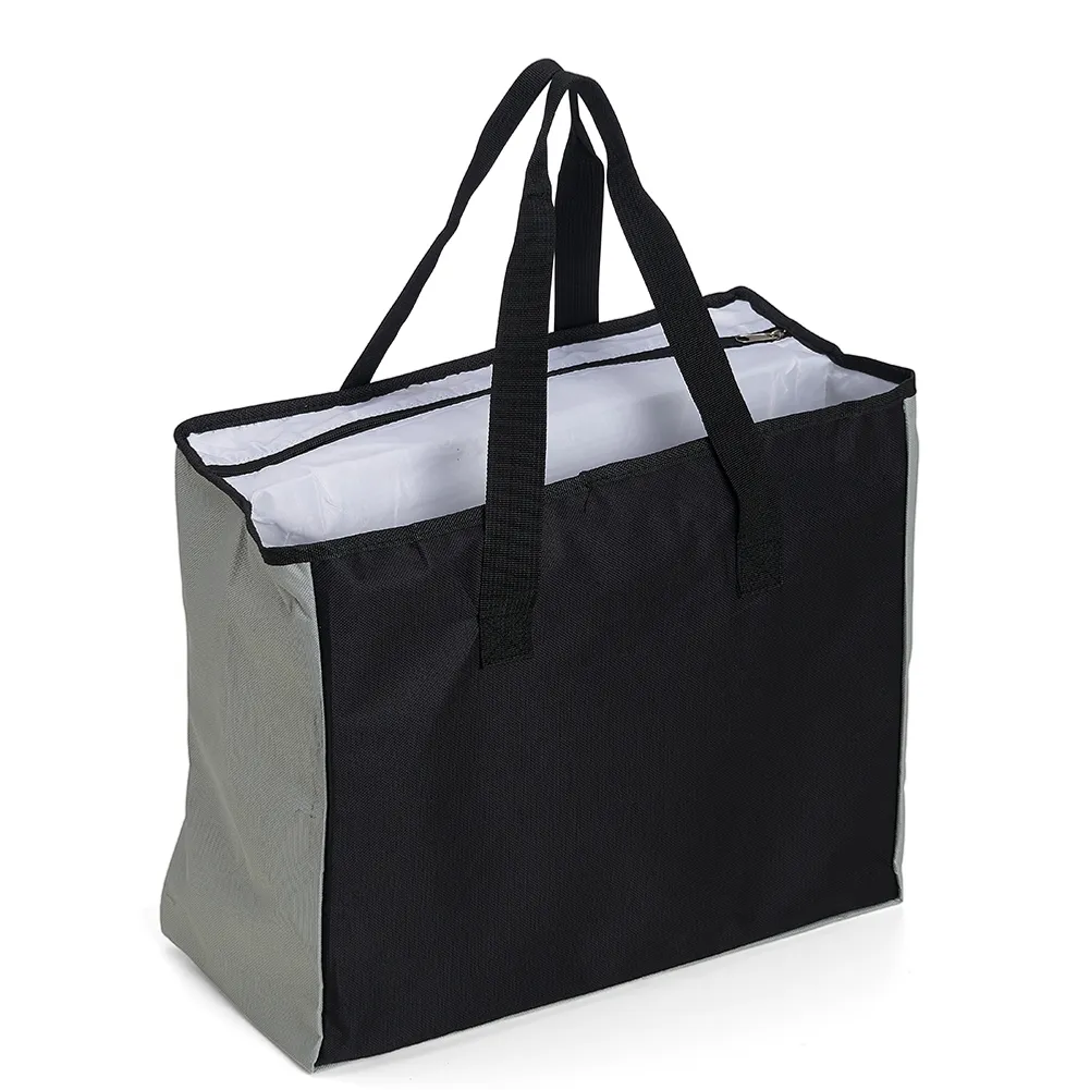 Sacola térmica de poliéster 25 litros com duas divisões, sendo uma delas com revestimento térmico e outra com bolso para acessórios.