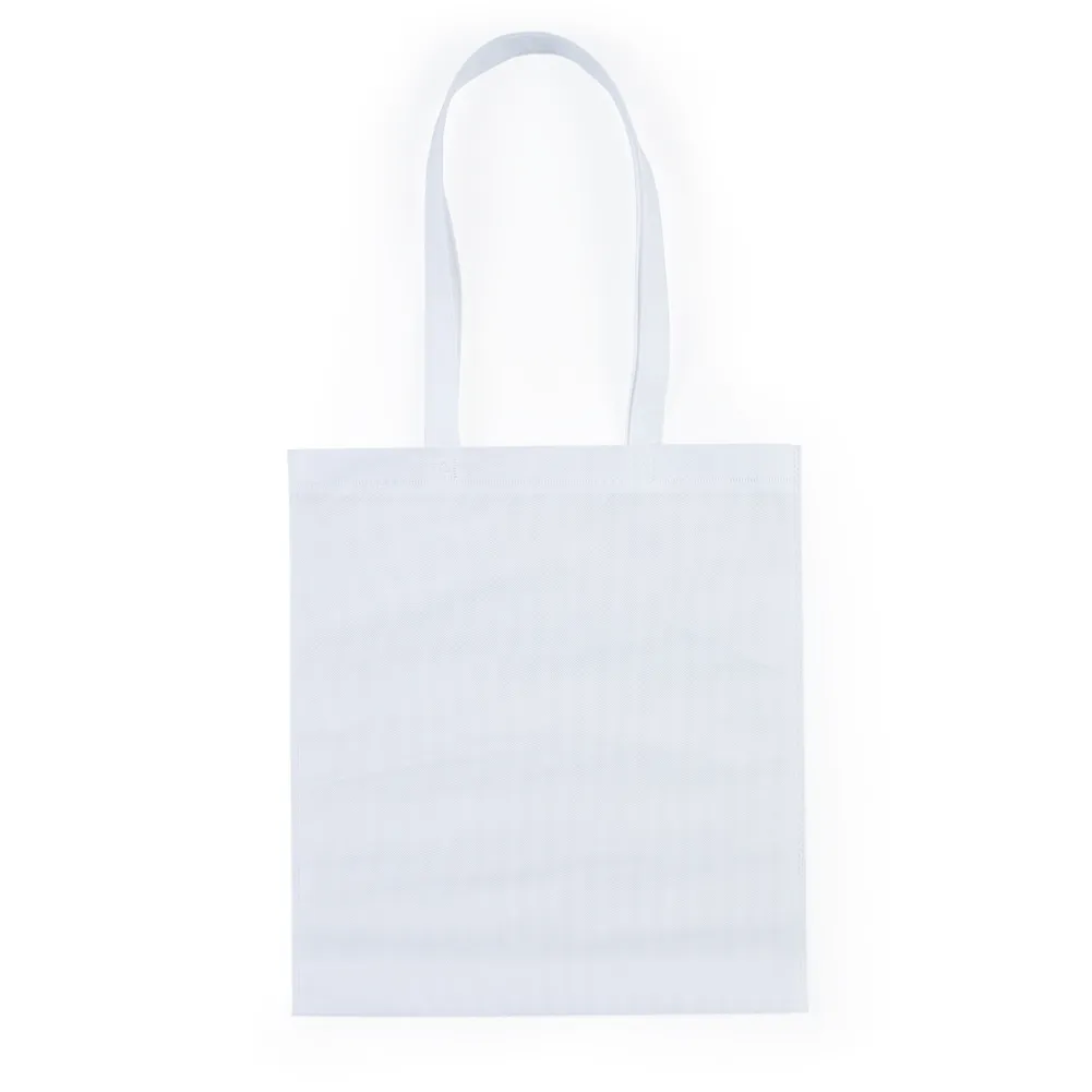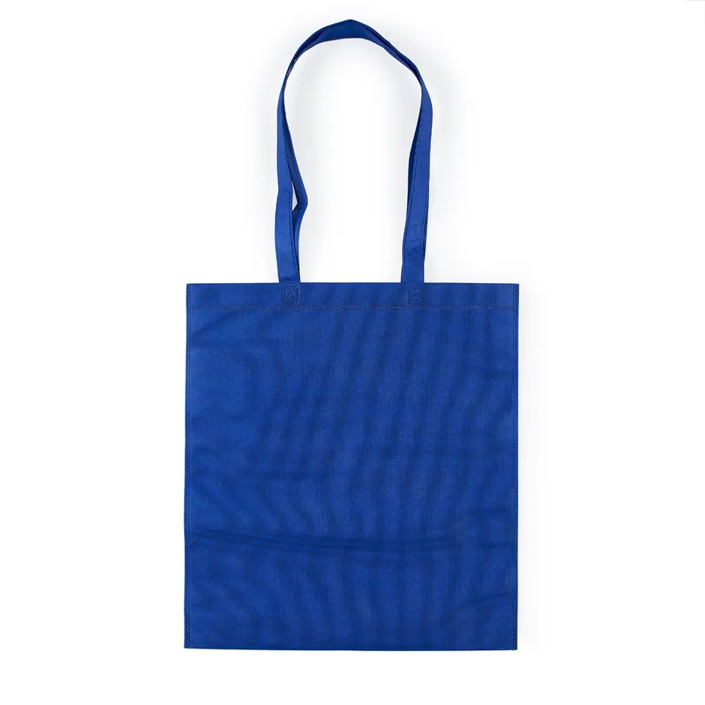 Sacola colorida com alça em material TNT, possui símbolo ecológico/reciclável na costura da alça.
