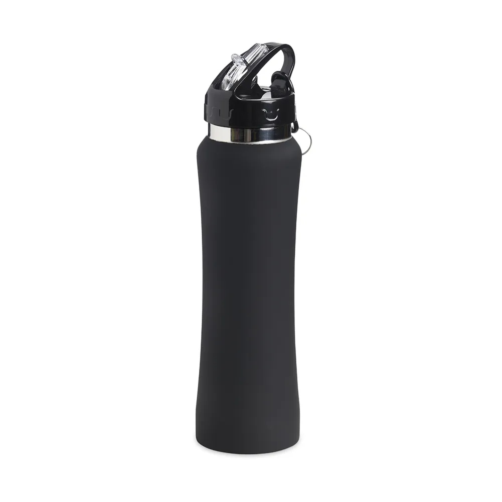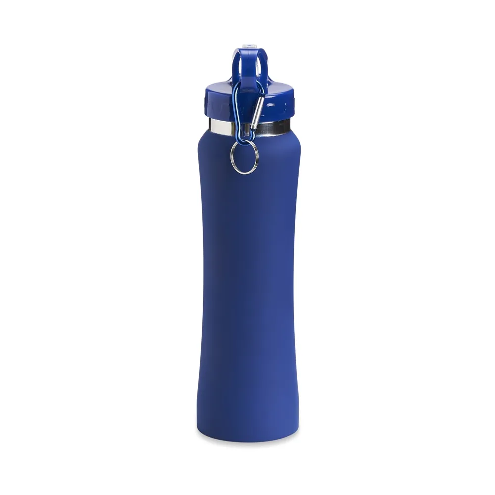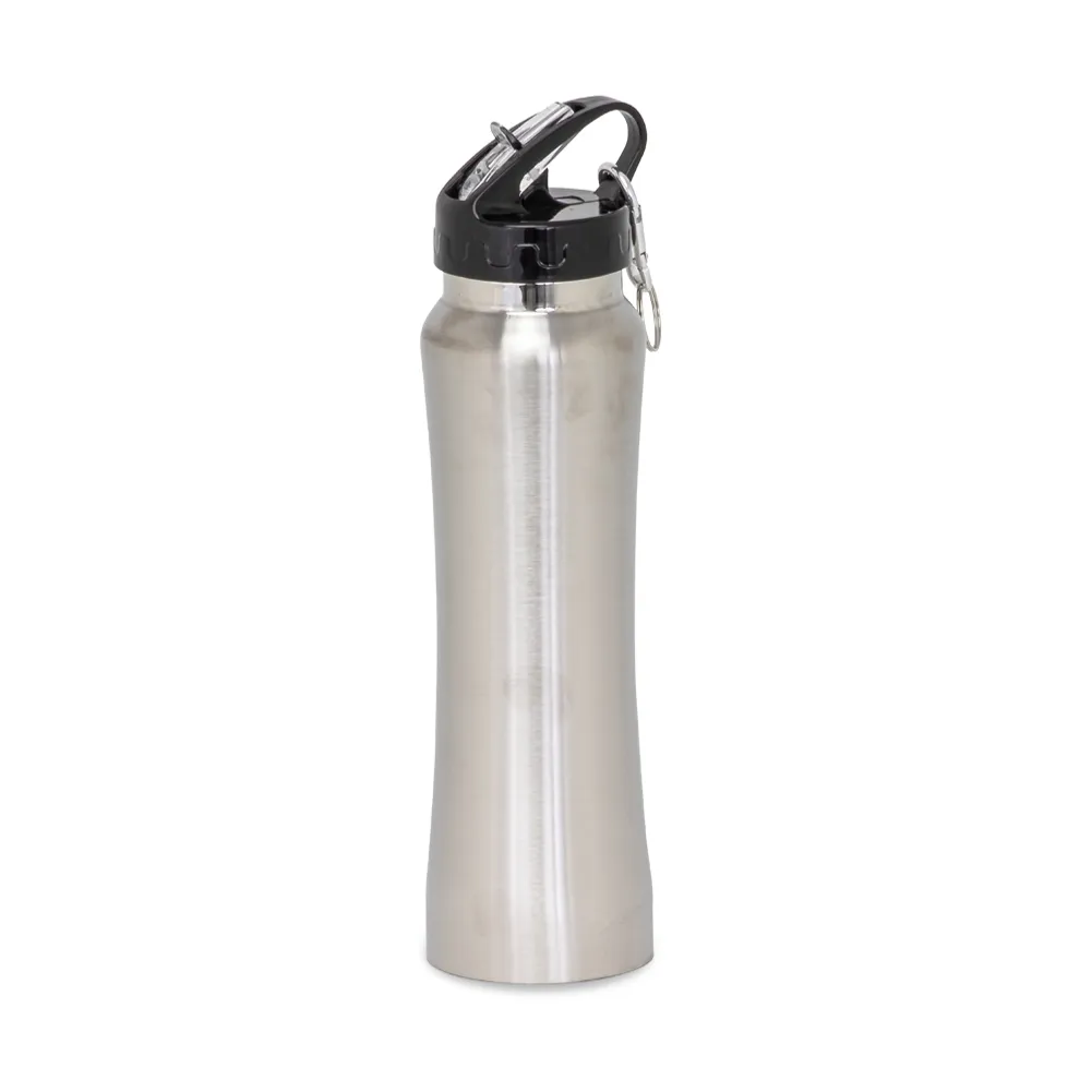 Squeeze de inox com capacidade de 750ml, tampa plástica com bico de canudo. Acompanha mosquetão.
