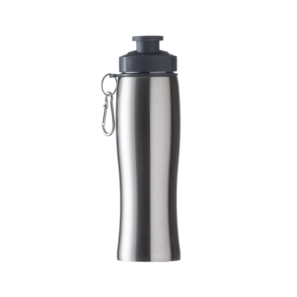 Squeeze inox 750ml com tampa plástica rosqueável e abertura superior, acompanha mosquetão. Tem a parte inferior emborrachada.