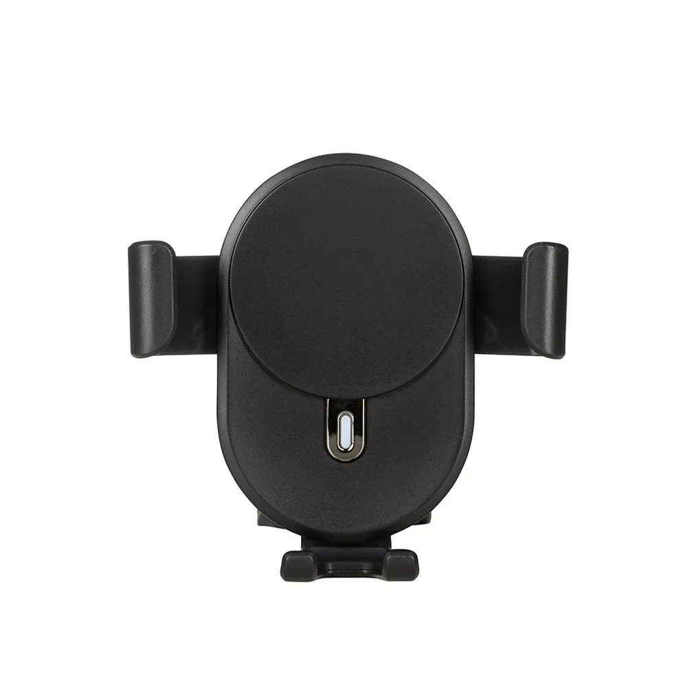 Suporte veicular com carregamento por indução. O produto contém hastes de ajuste automático. Acompanha presilha para encaixe na saída de ar do veículo e cabo USB para ativação do modo indução.