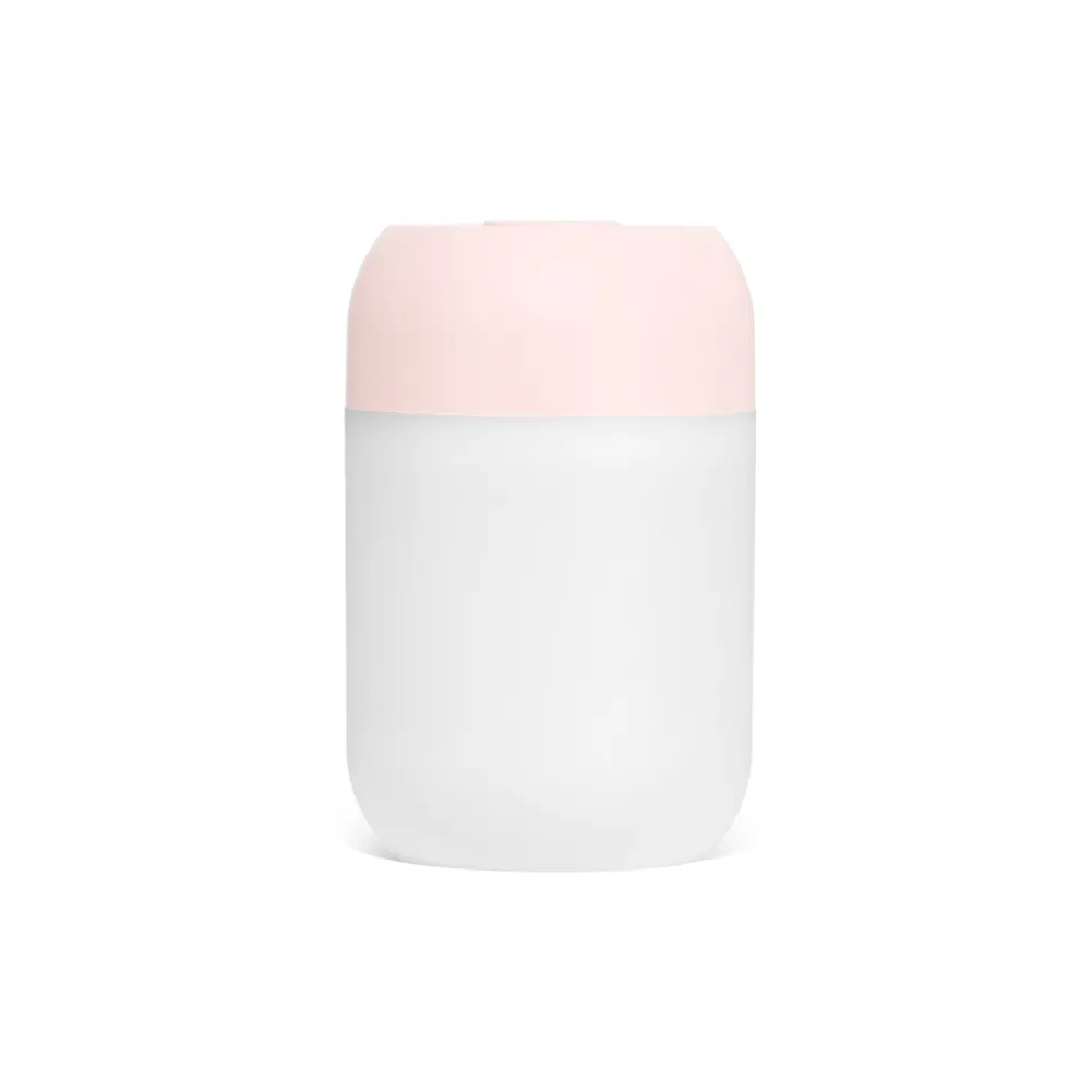 Umidificador de ar com LED, possui reservatório de água com capacidade de 350ml, dois níveis de névoa, contínua e com oscilação. Acompanha filtro de algodão e cabo USB V8.